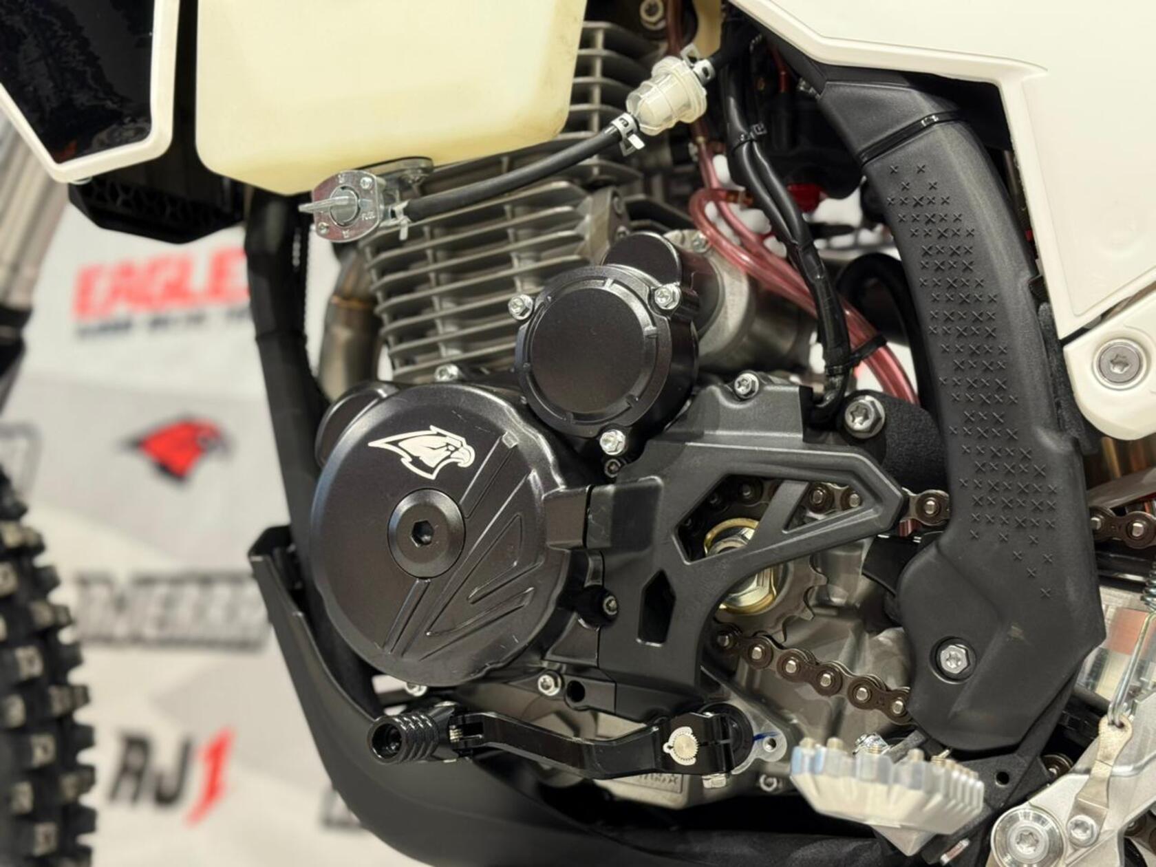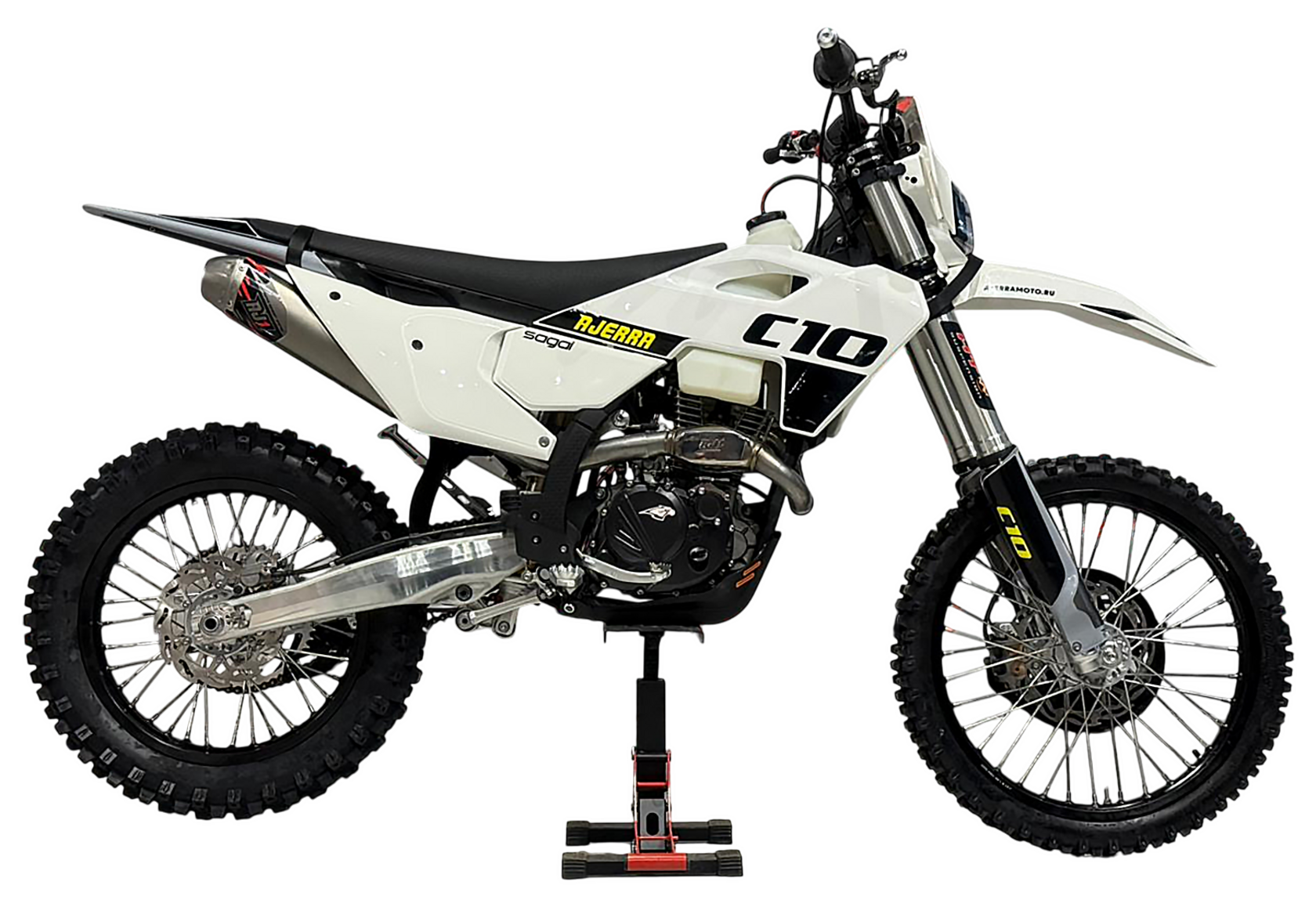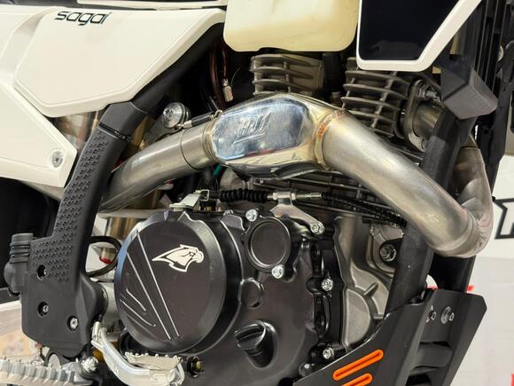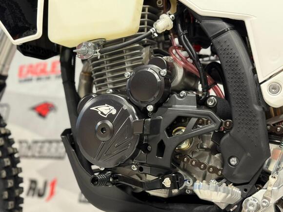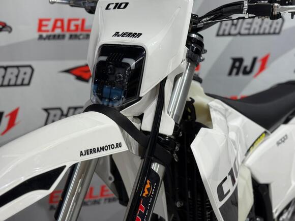 Мотоцикл AJERRA SAGAI C10 YB300H — это современный эндуро-байк, разработанный для уверенной езды как по пересечённой местности, так и по лёгкому бездорожью. Прочная рама К10 завода AJ1, копия KTM 2024 года, обеспечивает стабильность и точность управления в любых условиях, а качественный пластик в стиле Husqvarna 2024 года добавляет динамичный и стильный внешний вид. Двигатель Loncin YB300H 176 FMN с воздушным охлаждением демонстрирует надёжную работу, стабильную тягу и простоту обслуживания. В сочетании с карбюратором Nibbi Racing PWK 34 Black он обеспечивает точную подачу топлива и отзывчивость на газ, что делает мотоцикл удобным для активной езды и тренировок. Подвеска модели тщательно продумана: передняя вилка HTW SCC 930 мм с одним картриджем и задний амортизатор HTW 2450 с прогрессией гарантируют плавность хода и контроль над мотоциклом на неровных поверхностях. Алюминиевый маятник и фрезерованные траверсы AJ1 2024 повышают прочность конструкции и долговечность техники. Эргономика и управление на высоте: усиленный руль AL7075, алюминиевые подножки AJ1 2024 (копия S3), ручка газа Nibbi и грипсы Lock ON обеспечивают комфорт и надёжность в любых условиях. Светодиодная оптика 2 EYE LED Generation 4 (50W) позволяет безопасно ездить даже в сумерках, а алюминиевые обода UNISON 7116 и фрезерованные ступицы повышают прочность колёсной базы. Мотоцикл оборудован цепью KMC 520 Pro, алюминиевой ведомой звездой AL7075 51 зуб, а также выхлопной системой AJ1 2025, что делает его управляемым и надёжным при любых нагрузках. Для удобства и защиты техники предусмотрены счётчик моточасов, защита рамы и мотора, стропы передние и задние, заглушки руля. Сиденье AntiSkid обеспечивает комфортную посадку и предотвращает скольжение. Высота по седлу составляет 940 мм, что делает AJERRA SAGAI C10 YB300H удобным для райдеров среднего и высокого роста. Этот мотоцикл сочетает в себе высокотехнологичные комплектующие, надёжность и стильный дизайн, подходя как для спортивных покатушек, так и для любительского эндуро..