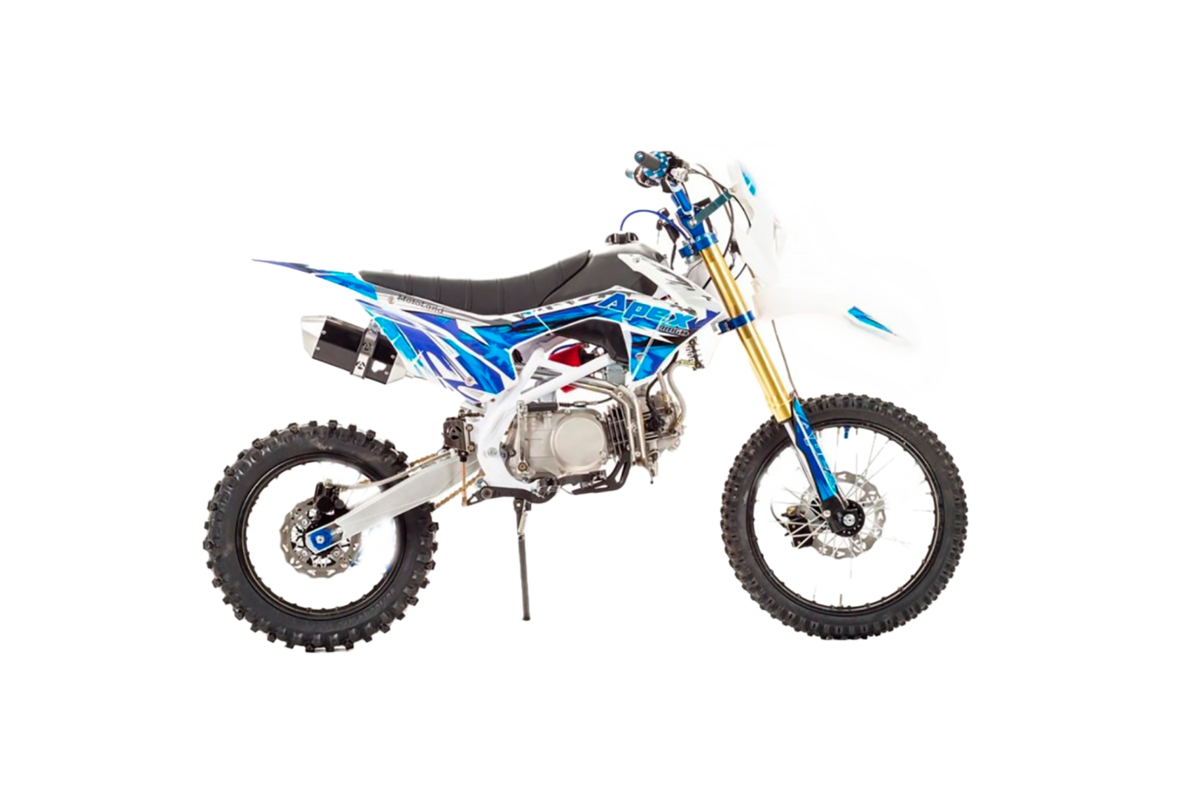 Недорогой надёжный питбайк APEX14 идеален для поездок по грунтовым дорогам и бездорожью. Хорошо чувствует себя на мягком и среднем грунте, разгоняется до 100 км/ч. Оснащён CNC траверсами, фарой, весит всего 70 кг. Питбайк прост в управлении и не требует специального ухода, подойдёт как новичкам, так и любителям мотокросса. У кроссового мотоцикла APEX14 отличный узнаваемый дизайн. Конструкция подчёркивает неуступчивый спортивный характер питбайка, который не остановится ни перед одним препятствием. Пластик комбинированный, прочный, не ломается при сгибании. Кроссовый мотоцикл APEX14 доступен в красном и синем цвете, при этом в основной цвет окрашен не только пластик, но и обода колёс и другие детали питбайка. Передняя подвеска — телескопическая нерегулируемая вилка перевёрнутого типа, которая отлично подходит для преодоления ям, ухабов и других неровностей плохих дорог или их отсутствия. Задняя подвеска маятниковая с моноамортизатором. Руль 22 мм с высоким подъёмом и перекладиной удобен для мотоциклистов разного роста. Ручки руля — комфортные PRO TAPER. Питбайк оснащён складными рычагами сцепления и переднего тормоза, а также CNC-лапкой переключения передач. Питбайк весит всего 70 кг, при этом выдерживает вес до 150 кг. Оснащён CNC траверсами, рама полудуплексная стальная, мотоцепь качественная. Колёса спицованные, сделаны из прочного и лёгкого алюминия. Размер заднего колеса — 14 дюймов (350 мм), переднего — 17 дюйм (430 мм). Тормоза дисковые, передний тормозной суппорт двухпоршневой, задний — однопоршневой. Питбайк оснащён карбюратором с фильтром нулевого сопротивления VM26 MIKUNI и одноцилиндровым четырёхтактным двигателем с воздушным охлаждением. Надёжный мотор мощностью 11 л. с. и объемом 140см³ разгоняет кроссовый мотоцикл APEX14 до 100 км/ч. Коробка передач механическая, четырёхступенчатая. Система зажигания электронная (CDI), для запуска двигателя можно использовать кикстартер. Покрышки с шипами и высоким грунтозацепом идеальны для бездорожья. Мощность мотора и небольшой вес питбайка позволяют ему преодолевать значительные препятствия и непролазную грязь, хорошо заходить в подъёмы. Также в комплекте есть щиток для номера, который ставится вместо фары. Питбайк 140 относится к недорогим моделям, которые при должной эксплуатации работают без сбоев и капризов. Кросс неприхотлив в обслуживании, не занимает много места в гараже. При необходимости в нём легко сменить любую повреждённую деталь.У нас Вы можете купить этот питбайк с бесплатной доставкой по РФ и гарантией до года. Также его можно приобрести в рассрочку или в кредит.