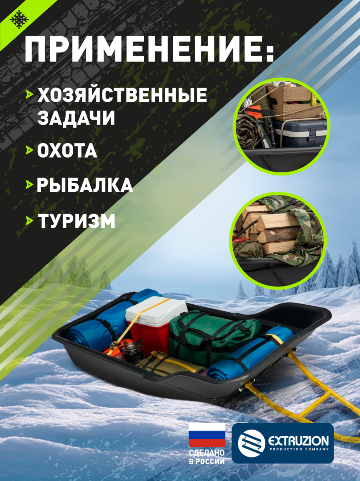 • Крупногабаритные сани-прицеп для профессионального использования с снегоходами и мотобуксировщиками. Увеличенные габариты 2100×860×490 мм обеспечивают повышенную вместимость для перевозки объемных грузов. Изготовлены из сверхпрочного ПНД с УФ-стабилизацией. Комплектуются сцепным устройством, стропами обвязки и накладными полозьями для улучшенного скольжения.