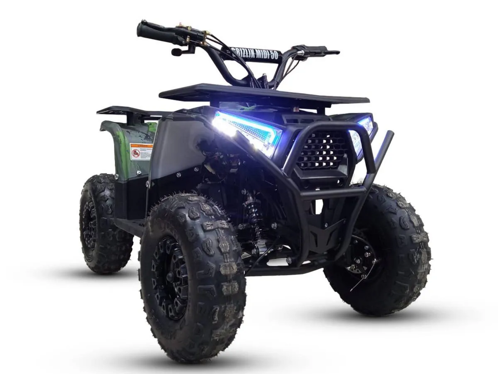 Представляем новый детский квадроцикл MOTAX Grizlik Midi с бензиновым двигателем объемом 50 кубических сантиметров, созданный специально для юных райдеров от 3 -х лет и старше. Этот надежный и безопасный квадроцикл станет отличным способом научить вашего малыша первым шагам в мире мототехники.Особенности квадроцикла: 1. Безопасность: Квадроцикл оснащен прочным стальным каркасом для обеспечения безопасности юного райдера. Также предусмотрены ограничители скорости и тормоза, которые помогут контролировать движение и сделать обучение более безопасным. 2. Бензиновый мотор: Благодаря двигателю объемом 50 куб. см, квадроцикл обладает достаточной мощностью для легкого и веселого катания по различным поверхностям. Мотор отличается надежностью и неприхотливостью в обслуживании. 3. Простота управления: Квадроцикл имеет эргономичное рулевое управление, что позволяет вашему ребенку легко освоить азы управления мототехникой. Также благодаря мягкой подвеске рассчитанной на легких райдеров, ребенок будет лучше контролировать квадроцикл и получать меньше дискомфорта на неровностях. Переключение передач интуитивно понятно и удобно для детей. 4. Возрастная категория: Квадроцикл предназначен для детей от 3-х до 8-10 лет (в зависимости от роста и веса ребенка). Он идеально подходит для обучения и развития первых навыков езды на мототехнике.
