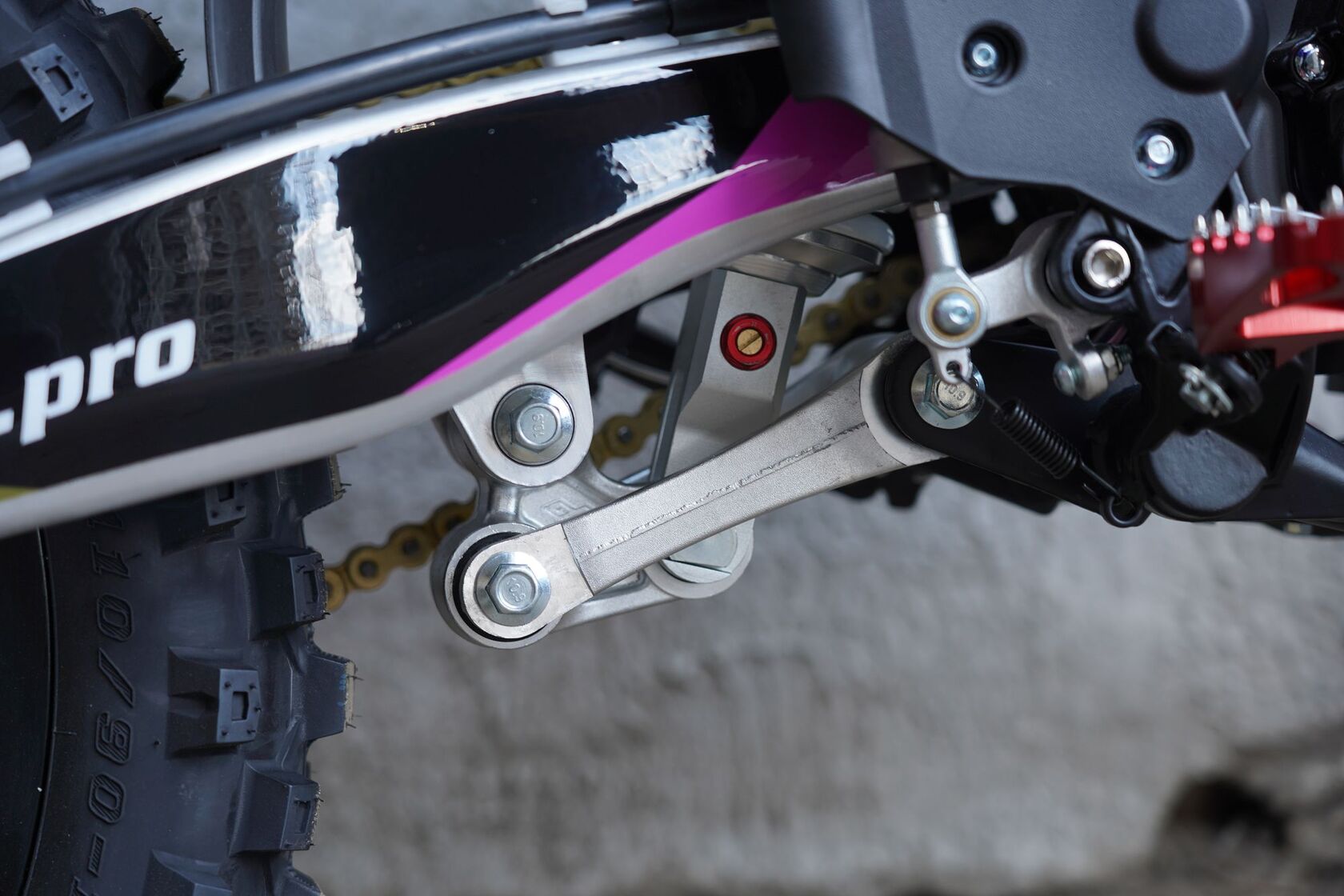 T8 Sport укомплектован профессиональной подвеской Mojo Racing (от компании ZL Sport). Передняя двухкамерная вилка с закрытым картриджем имеет полный диапазон регулировок, диаметр перьев - 48 мм, длина вилки – 930 мм, ход - 280 мм. Сзади установлен полностью настраиваемый моноамортизатор BSE Mojo Racing длиной 480 мм и ходом 120 мм. Подвеска с большими ходами помогает отрабатывать даже самые жесткие приземления, с лёгкостью "глотая" все неровности. Подвеску легко настроить под любой рельеф, любую трассу и стиль езды. Вы ощутите результат, когда будете сокращать секунды круг за кругом! Разработка подвески Mojo Racing производилась опытными инженерами-подвесочниками завода, а настройка - под чутким контролем заводской спортивной китайской командой BOSUER. Особое внимание было направлено на снижение веса всей подвески.Также комплектация Sport включает в себя обновленную переднюю тормозную гидравлическую систему с диском диаметром 240 мм и новым фрезерованным передним суппортом Mojo Racing, для более мощного и прогнозируемого торможения. Также усиленное сцепление, фрезерованные траверсы вилки, фрезерованные подножки с увеличенным зацепом и более легкую фрезерованную заднюю звезду.Наша гордость – мотор TYAN TYX250-SR. Данный мотор является эксклюзивным для бренда BSE на российском рынке. Официально только у BSE Russia есть разрешение на установку мотора TYAN TYX250-SR на свою продукцию. TYAN Motor - профессиональный производитель двигателей и мотоциклов из индустриальной провинции на юго-востоке Китая. TYAN Motor специализируется на разработке, производстве, продаже и сервисе высококачественных моторов и мотоциклов вот уже 11 лет. Капитал компании составляет 1,5 млн $. Территория завода – 29 гектаров, есть современное оборудование и автоматизированные транспортные линии. Собственный первоклассный отдел разработок (R&D center) защитил более 200 патентов. Продукция завода крайне распространена не только в Китае, но и во всем мире. Ежегодно выпускается 1.5 миллионов двигателей и 300 000 мотоциклов. Все нацелено на качество продукции. Цель компании: выпускать самые лучшие двигатели на рынке. Слоган компании: "Еще больше мощности при лучшем качестве".Новый двигатель TYAN TYX250-SR – один из самых технологичных, современных и мощных из доступных на китайском рынке. Рабочий объём -250сс, 4-х тактный, 2 распредвала DOHC, 4-клапанная ГБЦ, водяное охлаждение, балансирный вал. Система питания – спортивный карбюратор Nibbi Racing 34 Black. Все это позволило снять внушительные 29 л.с. при 9000 об. в мин. и 24 Нм при 7500 об. в мин. Коробка передач – механическая 6 ступенчатая, запуск – только электростартером. Мотор сделан максимально легким, прочным и эффективным, с минимальными вибрациями для комфортного передвижения.Ещё одна особенность модели Т8 – стальная рама, которая полностью соответствует всем стандартам самого известного австрийского бренда мотоциклов для кросса и эндуро – KTM. Единая геометрия, эргономика, пропорции и углы вылета вилки. Высококачественная сталь, малый вес и большой запас прочности, идеальная развесовка. Мотоцикл оснащен легким алюминиевым подрамником, системой прогрессии и пластиковой защитой мотора. Установлен прочный, легкий и современный тип пластика.На T8 установлен топливный бак на 8 л, звезды 13t – 49t, «зубастые» покрышки Carrystone 80/100-21 спереди и 110/90-18 сзади. Мотоцикл оснащается полностью светодиодной фарой головн