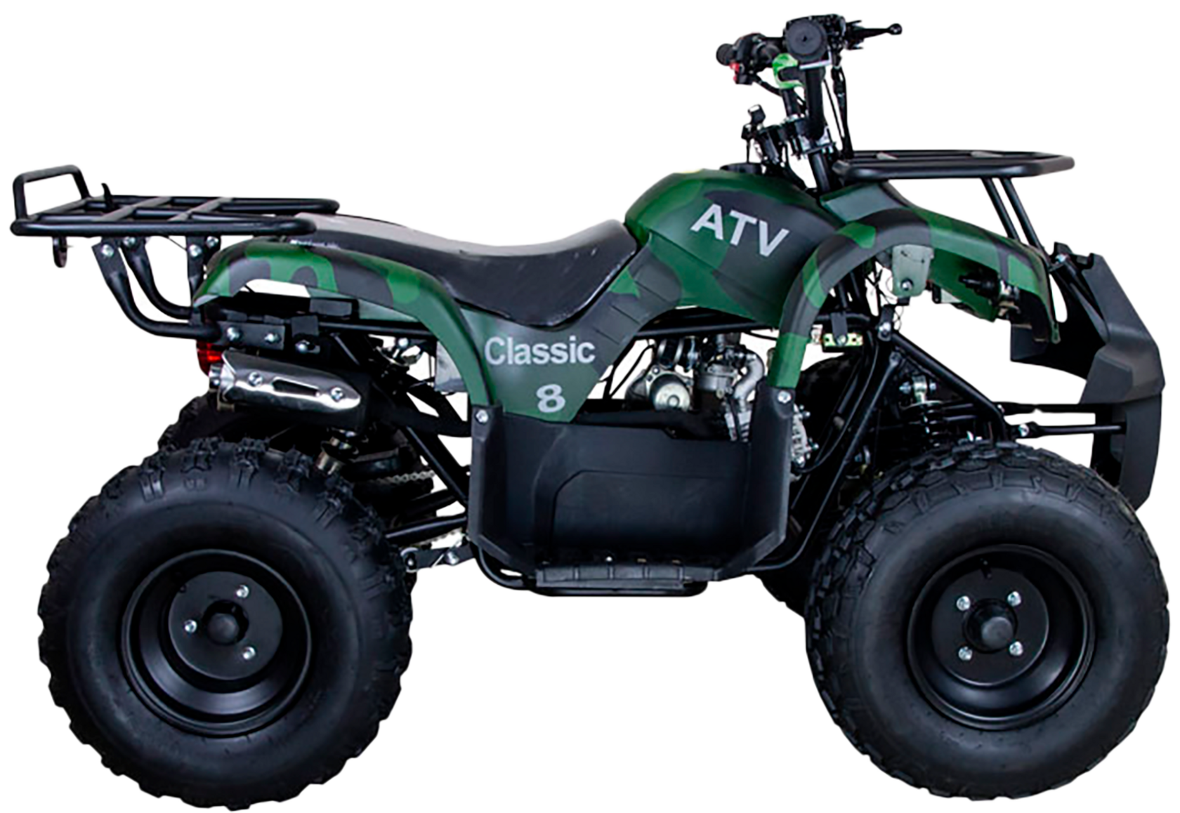 По габаритам это довольно компактный мотовездеход, при этом обладающий приличным двигателем и способный брать на борт человека весом до 120 кг. 125 кубов под капотом генерируют 9 л.с. Это как раз та цифра, которая позволяет полностью прочувствовать, что такое настоящий четырехколесник. При этом, квадроцикл ATV Classic 8 125 кубов универсален, и может использоваться даже детьми, так как его мощности не так много, чтобы малыш не справился с управлением. На малой скорости им очень легко маневрировать и учиться правильно тормозить, добавлять газа и входить в повороты.ДАННАЯ МОДЕЛЬ ПОСТАВЛЯЕТСЯ БЕЗ ПТС