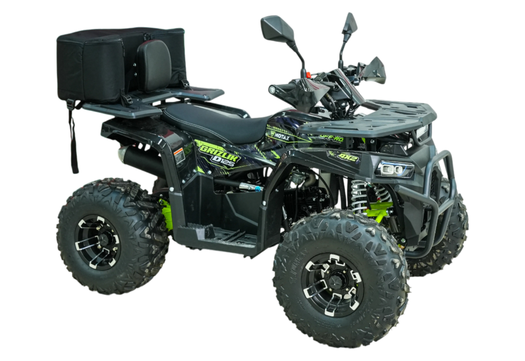 Квадроцикл бензиновый MOTAX GRIZLIK D125 LUX. Оборудован четырехтактным бензиновым двигателем, 125 кубов, мощностью 10 л.с. Развивает скорость до 55 км\ч. Допустимая нагрузка 100 кг.