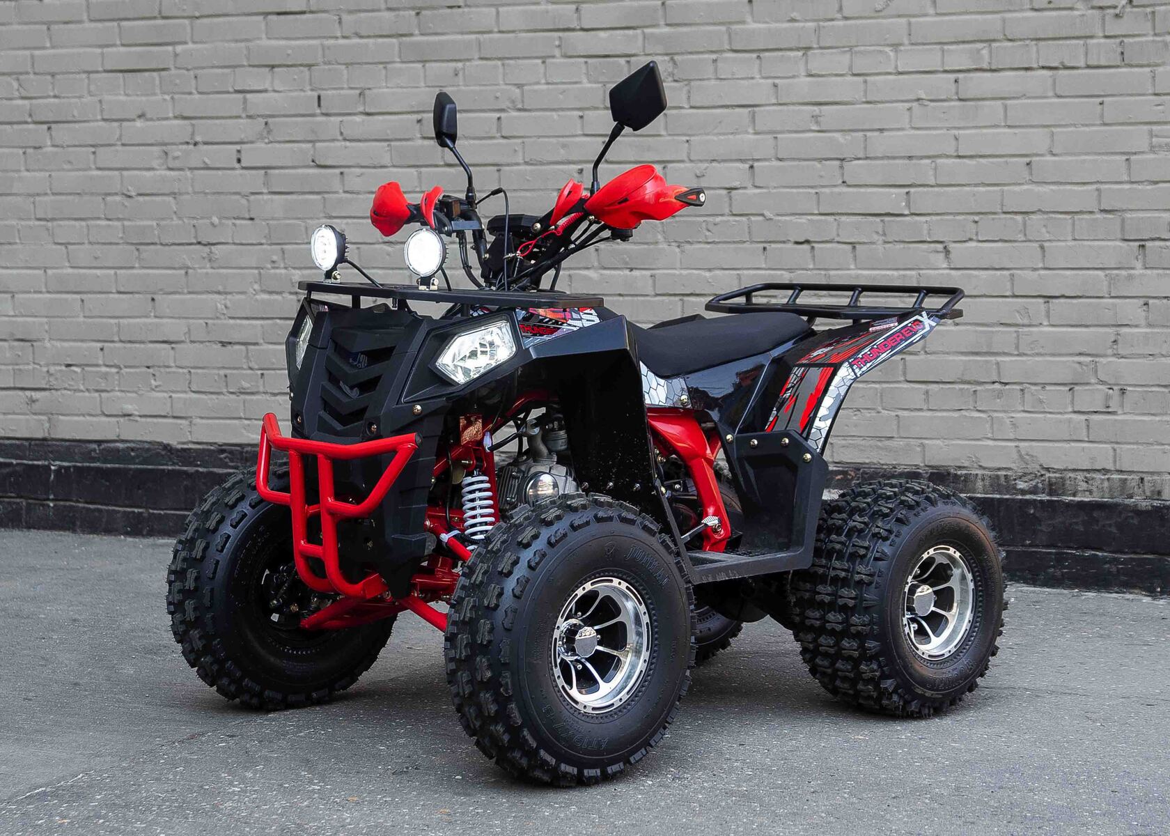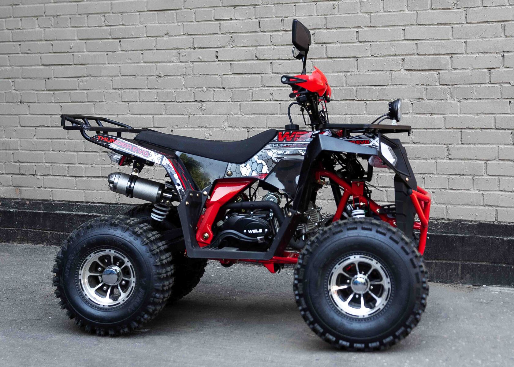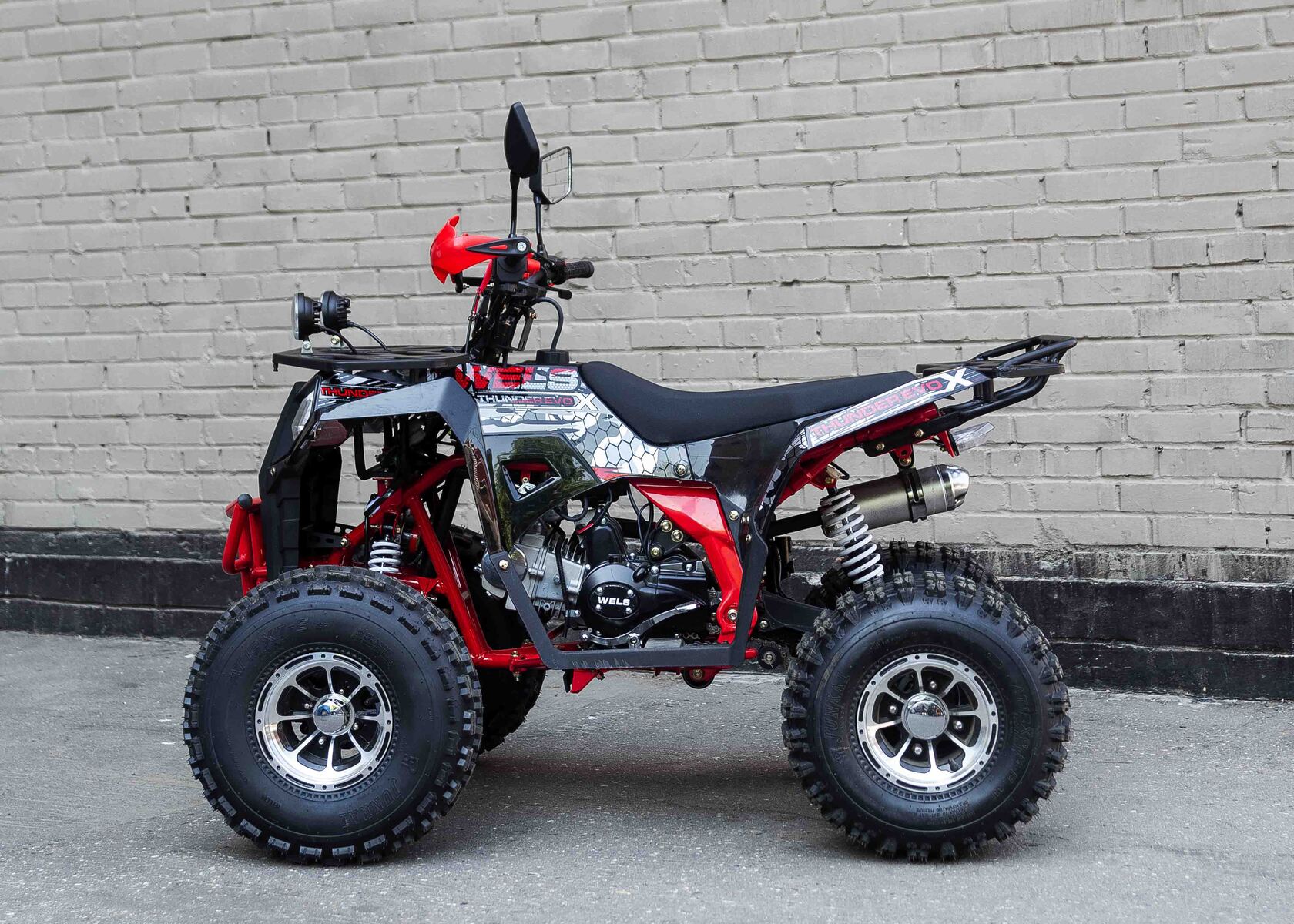 Стильная современная новинка 2019 года от компании WELS - квадроцикл для детей и подростков WELS THUNDER EVO X 125 предназначен для детей и подростков и обладает всеми необходимыми характеристиками, чтобы ребенок чувствовал себя на рулем настоящего квадроцикла, а его родители при этом были бы спокойны за безопасность юного пилота. ЛЮКСовая версия отличается от обычной наличием зеркал, дополнительной светодиодной оптики, спортивным глушителем, также квадроцикл укомплектован песочной резиной.125 кубового мотора вполне хватает для непоседливых гонщиков. Если же Вам кажется, что этого много - воспользуйтесь ограничителем скорости.Дисковые тормоза спереди и сзади обеспечат своевременную остановку перед препятствием.Защита рук в комплектации оградит ребенка от ударов веток и других помех.Песочная резина. Большие колеса 19,7-8, зад.: 18,9.5-8.Наличие укрепленных багажников спереди и сзади позволит установить на квадроцикл кофр и выезжать на природу с необходимым набором вещей и инструментов.Светодиодные фары для передвижения в темное время суток.Моточасы, светодиодные фары, звуковой сигнал, колпаки - все включено в комплектацию.Доступен в расцветках: черно-красный, бело-красный, живописно-красный, зеленый камуфляж