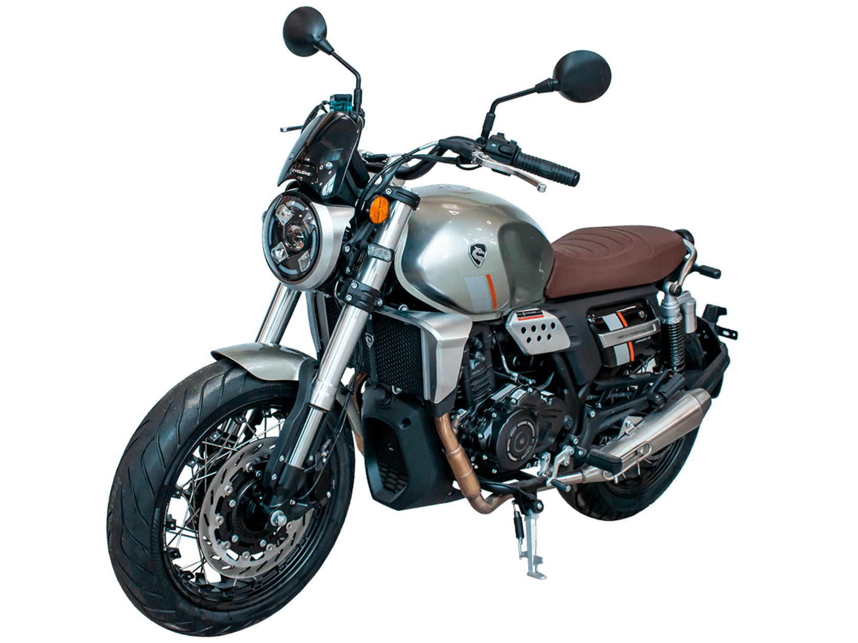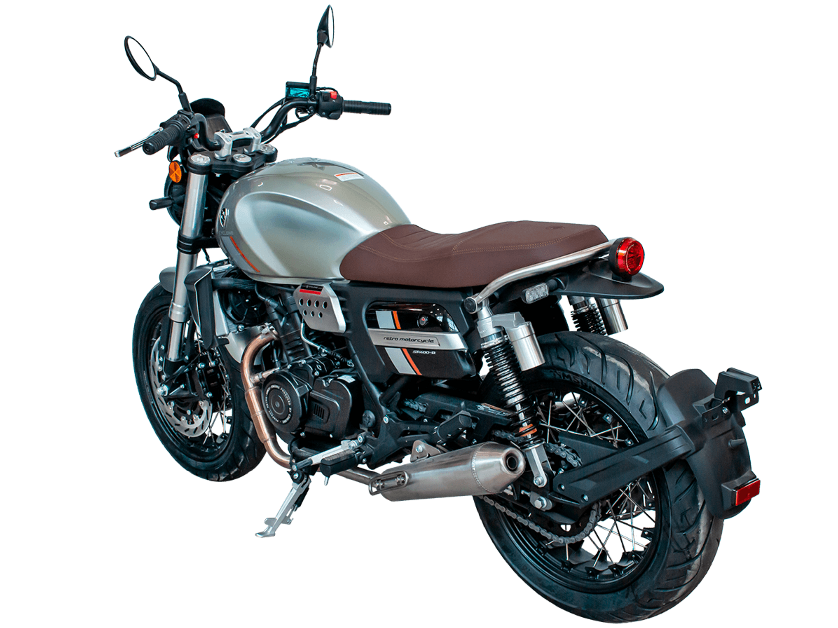 CYCLONE RE401 (SR400-B) 2024 – классик, в котором подчёркнутая простота объединяется с современными технологиями. Данная модель является более продвинутой версией модели RE3 (SR-400) – мотоцикл обладает более современным дизайном, снабжён стильными металлическими накладками на радиатор, а также топливным баком, объём которого увеличен до 20 литров.Двухцилиндровый четырёхтактный двигатель объёмом 401 см3 выдаёт 43 л.с. на 9500 об/мин. Инжекторный впрыск топлива с инжектором BOSCH увеличивает топливную экономичность, а также позволяет добиться высокой приёмистости и неприхотливости агрегата. Жидкостная система охлаждения не допустит перегрева двигателя даже при самом агрессивном вождении. На мотоцикл установлена 6-ступенчатая механическая коробка передач.Максимальная скорость мотоцикла составляет 150 км/ч.RE401 оснащён классическими спицованными колёсами диаметром 17 дюймов. Колёса обуты в бескамерные покрышки TIMSUN. С неровностями дороги эффективно справляются телескопическая вилка перевёрнутого типа спереди и маятник с двумя амортизаторами сзади. Ход передней подвески составляет 130 мм, задней – 81 мм. Оба компонента подвески являются регулируемыми. Эффективное и безопасное замедление с любых скоростей обеспечивают гидравлические дисковые тормоза с ABS спереди и сзади.Клиренс мотоцикла составляет 170 мм. Объём топливного бака – 20 л. Снаряжённая масса – 186 кг.Из дополнительного оборудования можно выделить USB-порт и датчики давления в шинах.Мотоцикл сочетает в себе отличные технические характеристики, комфорт и надёжность, что позволяет вам ощутить настоящую свободу на любой дороге.