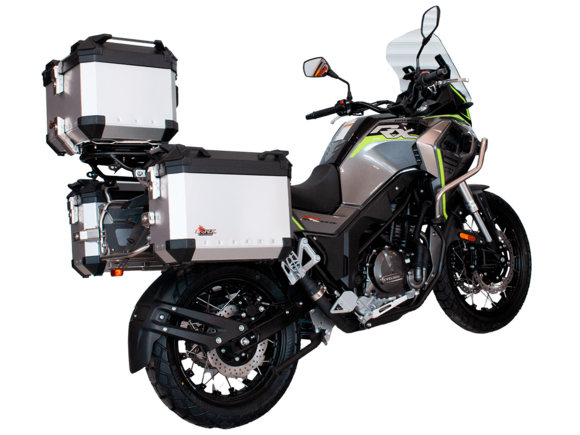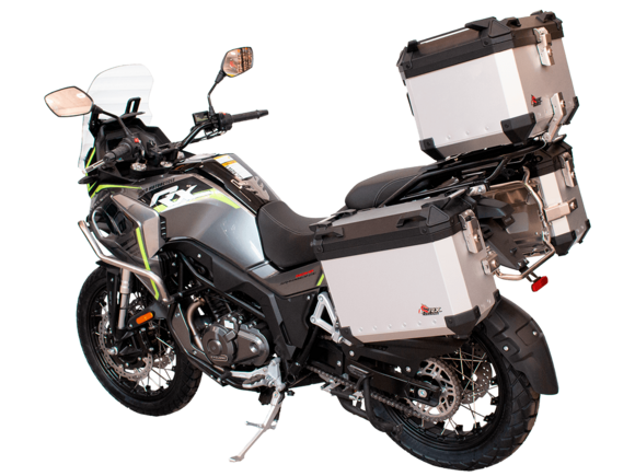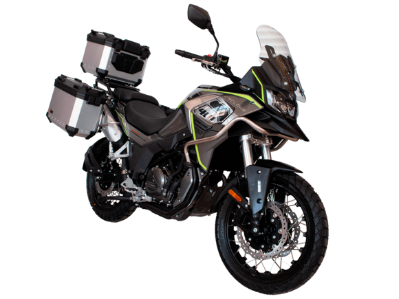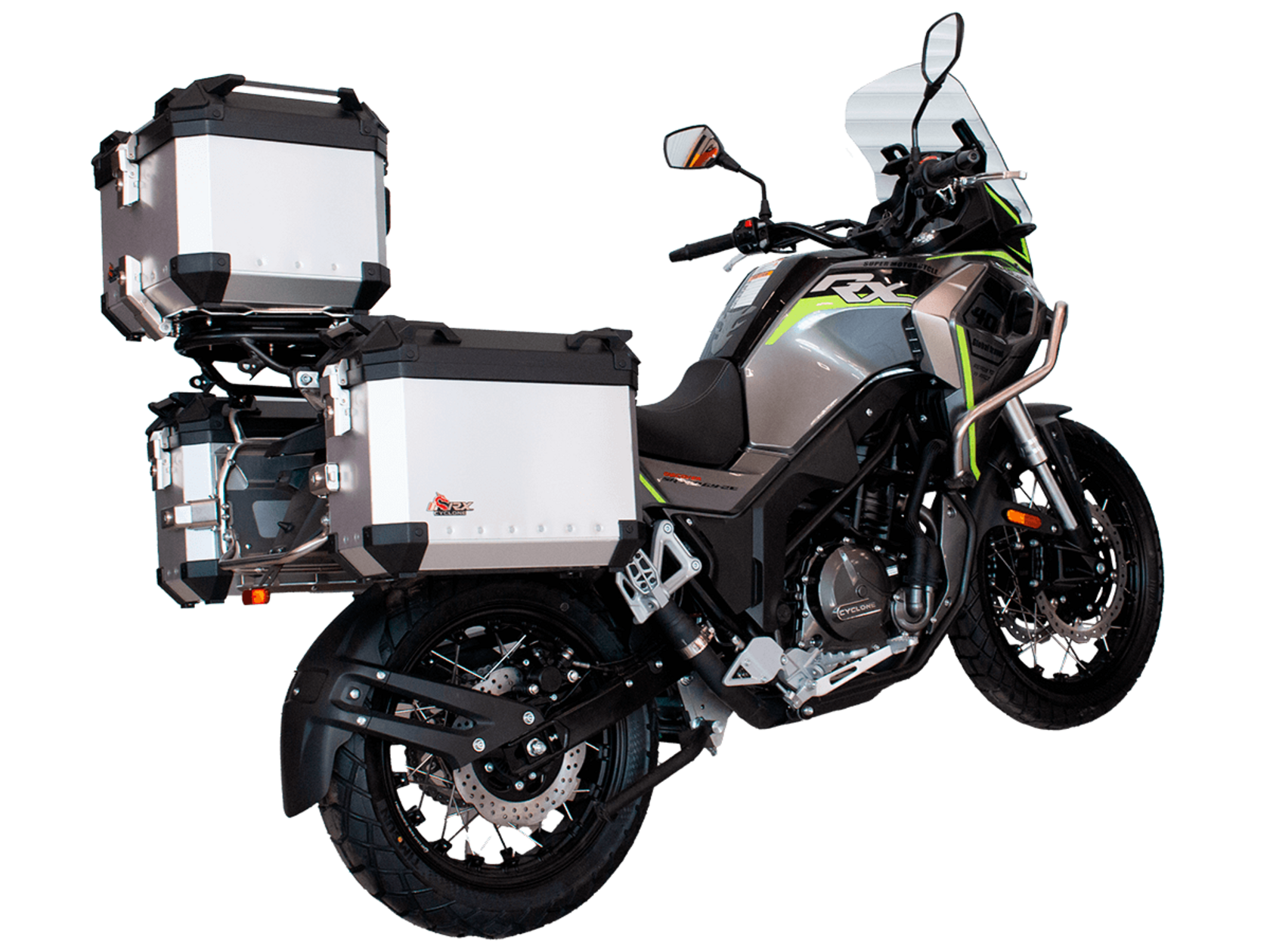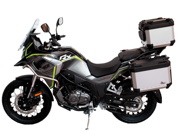 Мотоцикл CYCLONE RX401 (SR400GY-2D) – туристический эндуро, готовый бросить вызов любым дорогам и расстояниям. За рулём этого мотоцикла для вас не будет невозможных маршрутов. Его агрессивный дизайн всецело соответствует традициям жанра данного класса мототехники.Рядный двухцилиндровый четырёхтактный двигатель объёмом 401 см3 выдаёт 43 л.с. на 9500 об/мин. Максимальный крутящий момент достигается на 8000 об/мин и составляет 37 Н·м. Инжекторный впрыск топлива с блоком управления BOSCH увеличивает топливную экономичность, а также позволяет добиться высокой приёмистости и неприхотливости агрегата. Жидкостная система охлаждения не допустит перегрева двигателя даже при самом агрессивном вождении. На мотоцикл 6-ступенчатая механическая коробка передач.Максимальная скорость мотоцикла составляет 139 км/ч.RX401 оснащён спицованными алюминиевыми колёсами диаметром 17 и 19 дюймов. Колёса обуты в бескамерные покрышки от фирмы CST. С неровностями дороги эффективно справляются телескопическая вилка перевёрнутого типа спереди и маятник с моноамортизатором сзади. Ход передней подвески составляет 130 мм, задней – 55 мм. Оба компонента подвески являются регулируемыми. Эффективное и безопасное замедление с любых скоростей обеспечивают гидравлические дисковые тормоза с двухканальной системой ABS спереди и сзади.Клиренс мотоцикла составляет 185 мм. Объём топливного бака – 20 л. Снаряжённая масса – 215 кг.Мотоцикл отличает хорошо продуманная компоновка с высоко расположенным радиатором. На данной модели штатно установлены дуги безопасности, защита картера и двигателя, а также багажник с креплениями для боковых кофров. Кроме того, мотоцикл снабжён центральной подножкой для лёгкого обслуживания цепи, колес и вилки.Бортовой компьютер оборудован цветным дисплеем привлекательного дизайна со специальным защитным козырьком, спасающим от брызг и бликов. Из других приятных мелочей в допоборудовании мотоцикла стоит выделить 12-вольтовую розетку, подсветку пультов и USB-порт.Мотоцикл сочетает в себе отличные технические характеристики, комфорт и надёжность, что позволяет вам ощутить настоящую свободу на любой дороге с любым покрытием.