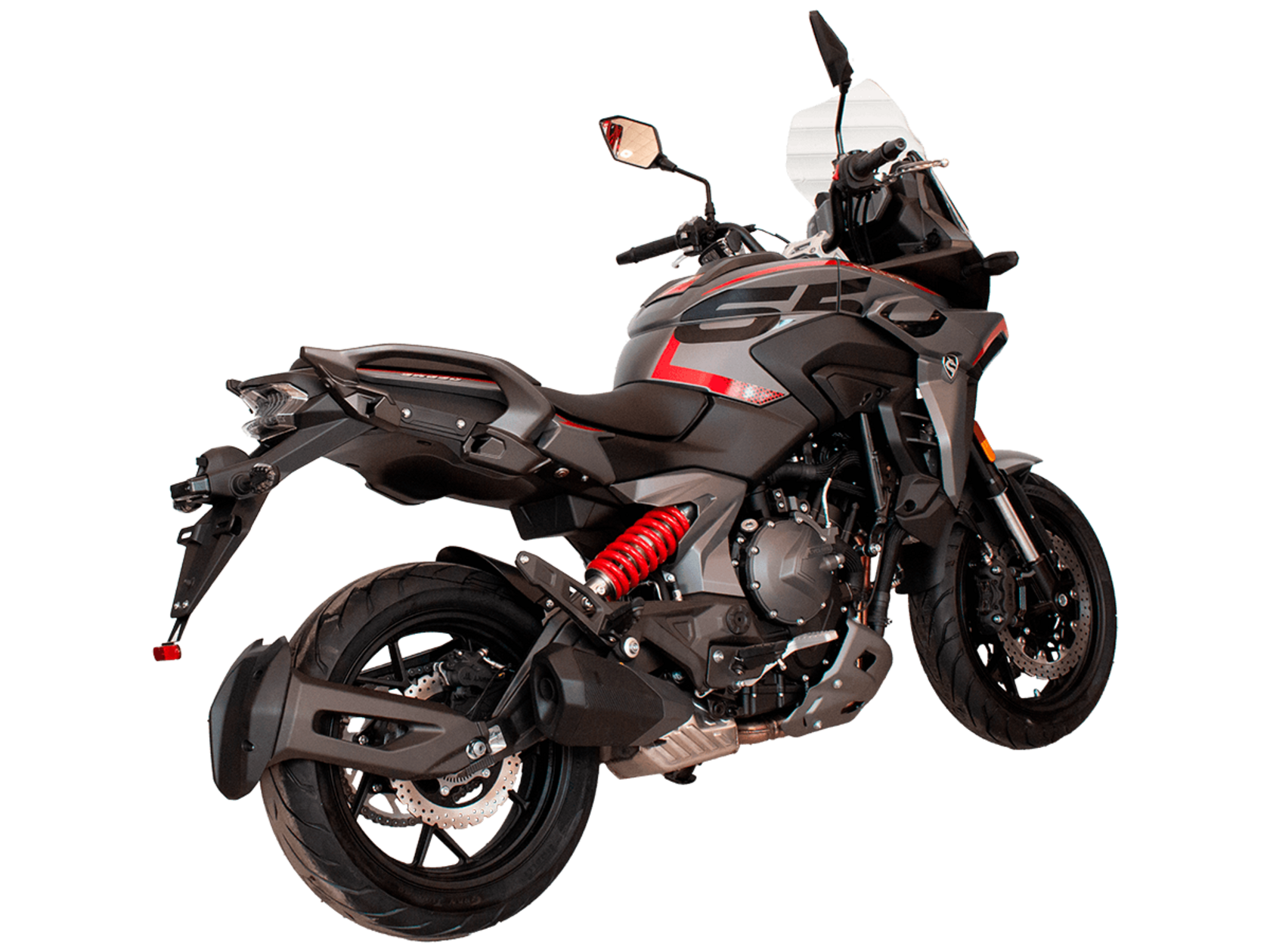 CYCLONE RX6 (SR650) – туристический эндуро для покорения самых непростых и протяжённых маршрутов. Он обладает агрессивным и современным дизайном, который выгодно выделяет его из всех остальных мотоциклов в своём классе. Мотоцикл дарит своему владельцу абсолютную свободу передвижения, позволяя долго и быстро ехать по шоссе, а при желании съезжать на такие дороги, по которым не проедет ни один дорожный мотоцикл. Небольшие габариты этого байка позволяют с успехом использовать его, как повседневный дорожный мотоцикл.Данная модель является самой крупнокубатурной в модельном ряде компании CYCLONE. Рядный двухцилиндровый четырёхтактный двигатель объёмом 650 см3 выдаёт мощность в 71 л.с. на 8500 об/мин. Максимальный крутящий момент достигается на 7000 об/мин и составляет 62 Н·м. Инжекторный впрыск топлива с блоком управления BOSCH увеличивает топливную экономичность, а также позволяет добиться высокой приёмистости и неприхотливости агрегата. Жидкостная система охлаждения не допустит перегрева двигателя даже при самом агрессивном вождении. На мотоцикл установлена 6-ступенчатая механическая коробка передач.Максимальная скорость мотоцикла составляет 180 км/ч.Модель оснащена литыми алюминиевыми дисками диаметром 17 дюймов. Колёса обуты в бескамерные покрышки от легендарной фирмы PIRELLI. С неровностями дороги эффективно справляются компоненты производства культовой японской компании KYB – телескопическая вилка перевёрнутого типа спереди и маятник с моноамортизатором сзади. Ход передней подвески составляет 130 мм, задней – 51 мм. Оба компонента подвески являются регулируемыми. Эффективное и безопасное замедление с любых скоростей обеспечивают гидравлические дисковые тормоза с двухканальной системой ABS спереди и сзади. Тормозные системы произведены известной испанской фирмой J.JUAN (входящей в легендарный холдинг BREMBO).Мотоцикл отличает хорошо продуманная компоновка с высоко расположенным радиатором. Высота 820 мм по седлу позволяет чувствовать себя комфортно даже райдерам небольшого роста. На данной модели установлена металлическая защита выхлопной системы и масляного фильтра. Под пассажирским сиденьем размещён небольшой, но крайне полезный набор инструментов.RX6 (SR650) оснащён бортовым компьютером с информативным цветным дисплеем и кнопками управления на руле, а также двумя штатными видеорегистраторами спереди и сзади. Из других приятных мелочей в допоборудовании мотоцикла стоит выделить регулируемое при помощи кнопки ветровое стекло, датчики давления в шинах, подсветку пультов, бесключевой доступ и 2 USB-порта.Клиренс мотоцикла составляет 165 мм. Объём топливного бака – 20 л. Снаряжённая масса – 245 кг.Мотоцикл сочетает в себе отличные технические характеристики, богатое оснащение, комфорт и надёжность, что позволяет вам ощутить настоящую свободу, отправившись на нём в любое путешествие.