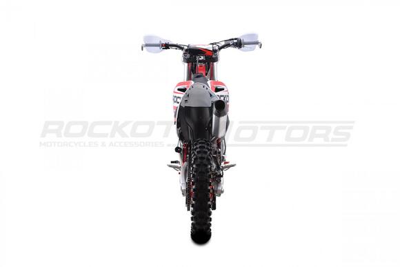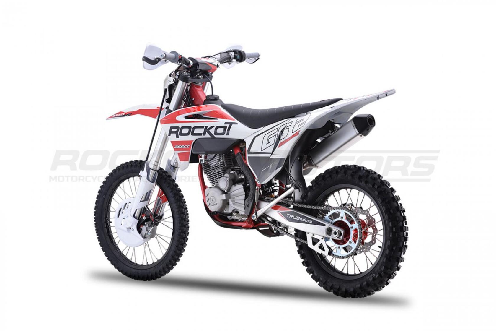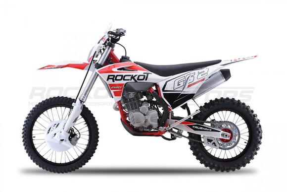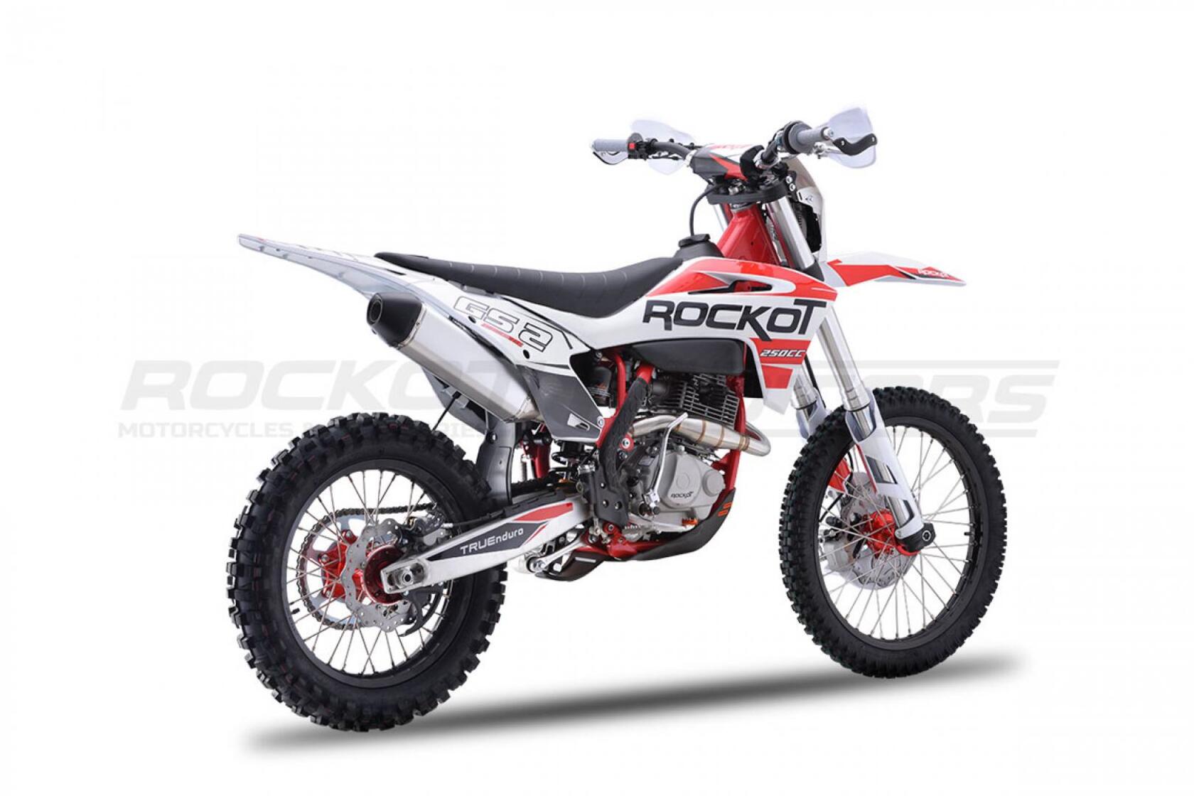 Вторая, обновленная версия эндуро мотоцикла ROCKOT GS 2 Origine.GS 2 Origine - полноразмерный эндуро мотоцикл, удовлетворяющий вкусу и потребностям как новичков, так и опытных райдеров.Мотоциклы ROCKOT серии GS, обрели высокую популярность, благодаря применению в плане дизайнерского и практического решения - пластика модели GASGAS.На белый пластик, нанесена графика в белой, красной, черной расцветке. Выбранное цветовое решение, придает мотоциклу броский, стильный дизайн, так характерный для внедорожной техники. Каждая деталь мотоцикла, дополняет общую концепцию дизайна.Обода колесных дисков окрашены в черный цвет, а красная графика нанесенная в виде наклеек, защитит ЛКП ободов от царапин. Алюминиевые ступицы окрашены в яркий, красный цвет.На черной раме установлена защита красно-черного цвета. Также, в красном цвете представлены: CNC крышка топливного бака и обслуживаемый топливный фильтр. Защита рук, складные, алюминиевые рычаги и траверсы окрашены в черный цвет.Предыдущая версия эндуро мотоцикла ROCKOT GS 2 Origine оснащалась двигателем CB250-F 172FMM-3A. Обновленный GS 2, обрел новый двигатель PR250 172FMM-5, с балансирным валом и пятиступенчатой КПП.Балансирный вал, значительно снижает уровень вибрации от двигателя, что ранее было единственным минусом двигателя CB250-F. Особенностью двигателя, можно считать то, что мощность двигателя осталась прежней - 21 лошадиная сила.За образование топливной смеси и ее подачу в двигатель, отвечает производительный карбюратор PE30. Повышает характеристики мощности и крутящего момента - обновленный “PowerBomb” увеличенного объема. Коробка передач - пятиступенчатая, с многодисковым сцеплением.ROCKOT GS 2 Origine построен на новой раме S8, которая является улучшенной, доработанной версией популярной рамы K8, аналогичной по геометрии рамам “австрийской троицы”. Рама производится из труб шестигранного сечения хром-молибденовой стали, которая является очень прочной и легкой. Подрамник производится из алюминия. Геометрия рамы, благодаря правильно выверенному центру тяжести и углу наклона вилки - способствует наилучшей управляемости устойчивости мотоцикла на низкой скорости.Устанавливаемая на мотоцикл ROCKOT GS 2 Origine подвеска известной фирмы “KKE” - делает мотоцикл одним из наиболее подходящих для проезда по сложным эндуро маршрутам. Спереди расположена телескопическая вилка перевернутого типа, длиной - 940 мм и толщиной рабочего штока - 48 мм. Конструкция вилки - регулируемая с картриджем открытого типа. Данная конструкция подвески отлично проявляет себя в эндуро, в том числе и в режиме гонки.Сзади установлен усиленный маятник из алюминия, который соединен с задним моноамортизатором, посредством системы рычагов прогрессии. Моноамортизатор “KKE” длиной 470 мм, регулируется на скорость сжатия, скорость отбоя и преднатяжение пружины. Широкий диапазон регулировки передней и задней подвески, позволит точно настроить ее работу под вес и стиль езды каждого райдера. Система прогрессии, обеспечивает равномерную, мягкую работу и увеличивает длину рабочего хода подвески..