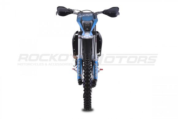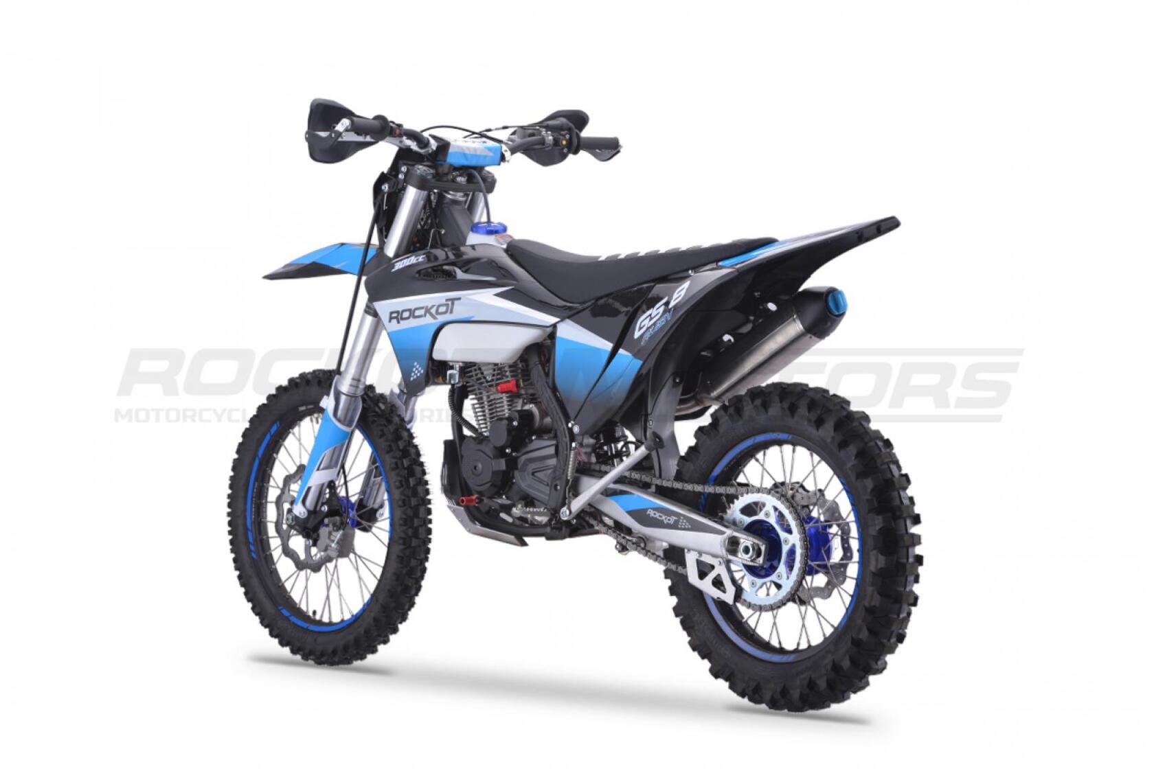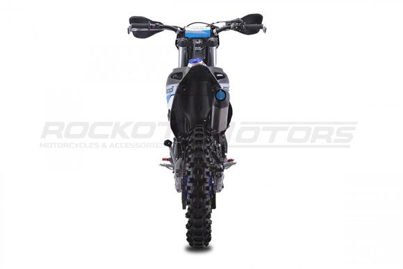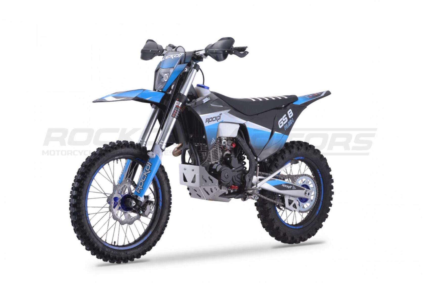 ROCKOT GS 8 RUSH - абсолютная новинка лета 2023 года от компании ROCKOT-MOTORS. Полноразмерный эндуро мотоцикл, с топовой подвеской и совершенно новым мотором, которого ждет не меньший успех, чем “народный” 172-ой.ROCKOT GS 8 RUSH - построен на новой раме S8, в облицовке австрийского GASGAS. Пластик отлит в черном цвете, на который нанесена яркая, контрастная графика в сочетании черного, синего и серого цветов. Расцветка графики эффектно подчеркивает каждую деталь мотоцикла. Рама, траверсы, руль, рычаги тормоза и сцепления, окрашены в черный цвет. В синем цвете выполнены колесные ступицы, CNC крышка бака и защитные наклейки на ободьях колес. Все остальные детали мотоцикла окрашены в серый, металлический цвет.Производительная тормозная система, превосходно останавливает байк на бездорожье даже при резком, экстренном торможении. Превосходный и ощутимый отклик тормозной системы на каждое усилие при нажатии, не позволит Вам допустить ошибку при торможении. Гидролиния переднего и заднего тормоза - армированная. Спереди установлен двухпоршневый тормозной суппорт, сзади - однопоршневый.Задняя тормозная система максимально защищена: задний тормозной цилиндр закрыт пластиковой защитой рамы. Также защищены и задние тормозные суппорт и диск.ROCKOT GS 8 RUSH – полноразмерный эндуро мотоцикл с мощным двигателем воздушно-масляного охлаждения. Данная модель вполне заслуженно является одной из лучших, среди эндуро мотоциклов предназначенных для гонок класса «Lite» и способна привезти новичка на «тумбу победителей».