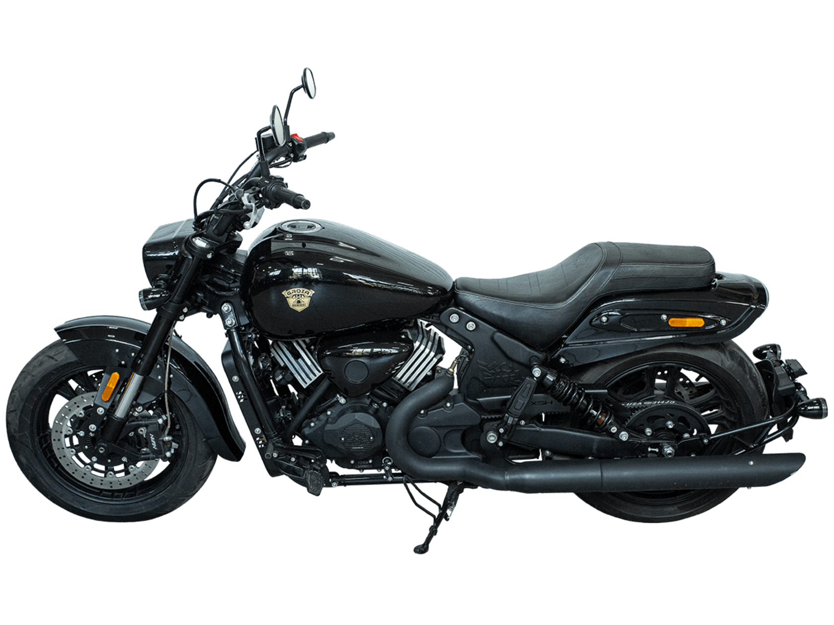 GROZA YL800 – великолепный круизёр, который подойдёт как для повседневной городской езды, так и для комфортного перемещения на длинные дистанции. Его дизайн исполнен в классическом стиле, соответствующем всем канонам данного типа мотоциклов.Двухцилиндровый V-образный двигатель объёмом 800 см3 мощностью 61 л.с. при высоких показателях динамики и отличном крутящем моменте способен разгонять аппарат до 180 км/ч. Инжекторный впрыск топлива с инжектором DELPHI увеличивает топливную экономичность, а также позволяет добиться высокой приёмистости и неприхотливости агрегата. Привод на ведущее колесо осуществляется ремнём знаменитой марки USA Gates. Жидкостная система охлаждения не допустит перегрева мотора даже при самом агрессивном вождении.Аппарат имеет 6-ступенчатую механическую коробку передач с классической схемой “1-N-2-3-4-5-6”. На мотоцикл установлены литые алюминиевые диски диаметром 17 дюймов. Ширина передней покрышки – 140 мм, задней – 200 мм. С неровностями дороги эффективно справляются телескопическая вилка перевёрнутого типа спереди и маятник с двумя газонаполненными амортизаторами сзади. Подвеска имеет 7 ступеней регулировки, что обеспечивает лёгкую перестройку на различные режимы езды. Для всего класса круизёров такая опция – большая редкость. Эффективное и безопасное замедление с любых скоростей обеспечивают гидравлические дисковые тормоза спереди и сзади от компании NISSIN.Аппарат оснащён своеобразной и очень привлекательной по дизайну светодиодной оптикой, а также бортовым компьютером и ярким и информативным дисплеем.Мотоцикл сочетает в себе отличные технические характеристики, богатое оснащение, комфорт и надёжность, что позволяет вам ощутить настоящую свободу на любой дороге.