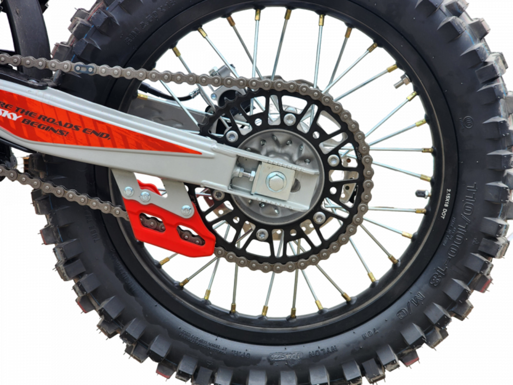 Hasky F5 Ride 2025 представляет собой самую доступную модель в линейке бренда, отличаясь от старшей F5 PRO 2025 комплектацией, но сохраняя при этом надежность и качество, присущие семейству Hasky. Этот среднеразмерный эндуро-мотоцикл на колесах 21"/18" построен на прочной раме K5.В основе модели лежит надежный двигатель Loncin TM300, оснащенный балансировочным валом для снижения вибраций, пятиступенчатой коробкой передач и комбинированной системой запуска (электростартер + кик-стартер). Подачу топлива обеспечивает производительный карбюратор Nibbi PE 30 Race. Управляемость и комфорт на бездорожье обеспечивают передняя регулируемая вилка MTN диаметром 43 мм и задний моноамортизатор.Мотоцикл комплектуется передним колесом 21" с покрышкой 80/100-21 и задним 18" с покрышкой 110/100-18, оснащенными фиксаторами. Эргономика управления улучшена за счет новых пультов в стиле KTM, ручки газа Nibbi и грипсы lock-on. Защита двигателя, рамы и перьев повышает долговечность. Дополнительные удобства включают подножки для пассажира, пеги увеличенной ширины от AJ1, мощную светодиодную фару и счетчик моточасов.Особое внимание уделено безопасности и надежности: воздушный фильтр увеличенной площади изготовлен из негорючего материала, а вся проводка мотоцикла полностью влагозащищенная. В комплект также входит набор инструментов AJ1, а новая усиленная графика придает модели стильный вид. Hasky F5 Ride 2025 предлагает отличное сочетание цены, надежности и оснащения для начинающих и опытных райдеров.