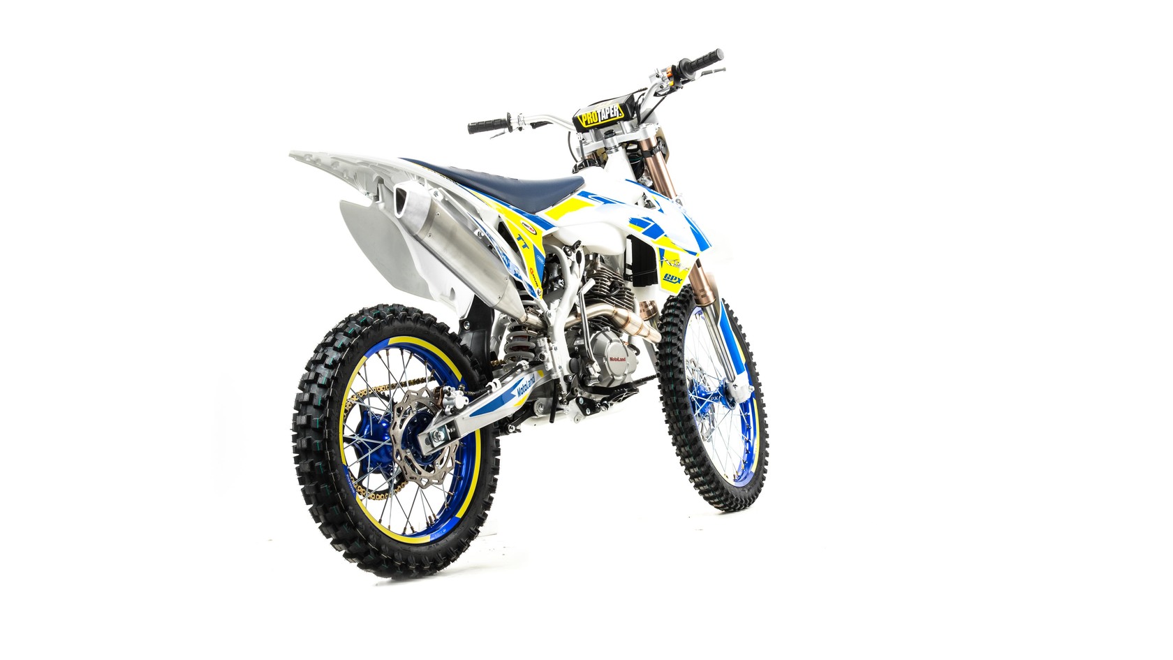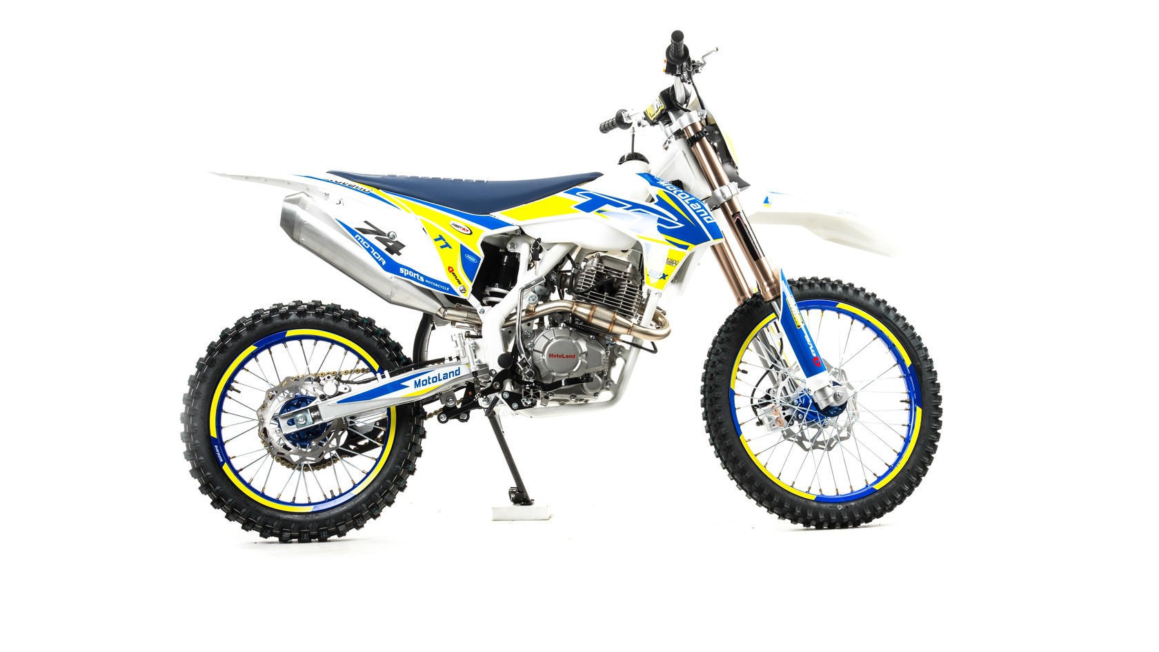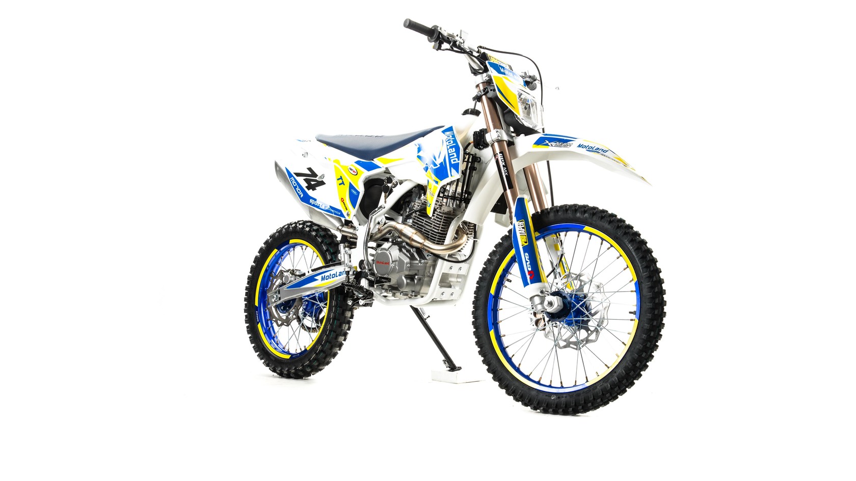 MotoLand TT 250 Новинка весны 2020 года.Надёжная техника из самых популярных компонентов оснащена Двигателем ZONGSHEN 172FMM с кикстартером и электростартером Мощностью 21 Л.С. на двигателе установлен Карбюратор NIBBI PE28.Это полноразмерный кроссовый мотоцикл его база по осям составляет 1430 мм., и габаритами 2180х800х1300 мм. Высота по седлу составляет 950 мм., что по сравнению с Моделью XT 250 ST 21/19 ниже порядка 20 мм. Что позволяет комфортно себя чувствовать райдерам среднего роста.За счет сбалансированной базы мотоцикл имеет отличную управляемость, а конструкция рамы и особенности настройки подвески GPX способствуют максимальному поглощению неровностей дорожного покрытия, а так же усиленная прогрессия на игольчатых подшипниках.Алюминиевые обода c антибуксаторами, усиленными спицами и ступицами CNC. На кроссовой резине Yuanxing 80/100-21 / 100/90-18На мотоцикле установлена обновлённая тормозная система аналог «brembo» с медными колодками , что обеспечивает отличные тормозные характеристики. Особенностью заднего тормоза является, лапка верхнего расположения с эксцентриковой регулировкой.Выпускной патрубок с резонатором Power Bomb имеет крепления на пружинах для снижения вибрации. Глушитель с уникальным дизайном прямоточного типа, полностью алюминиевый для облегчения веса.