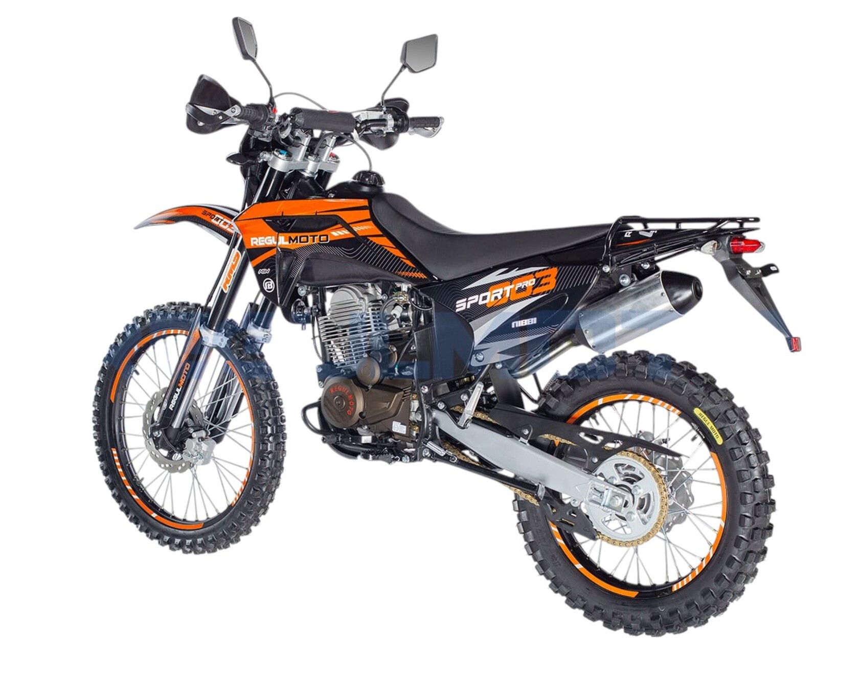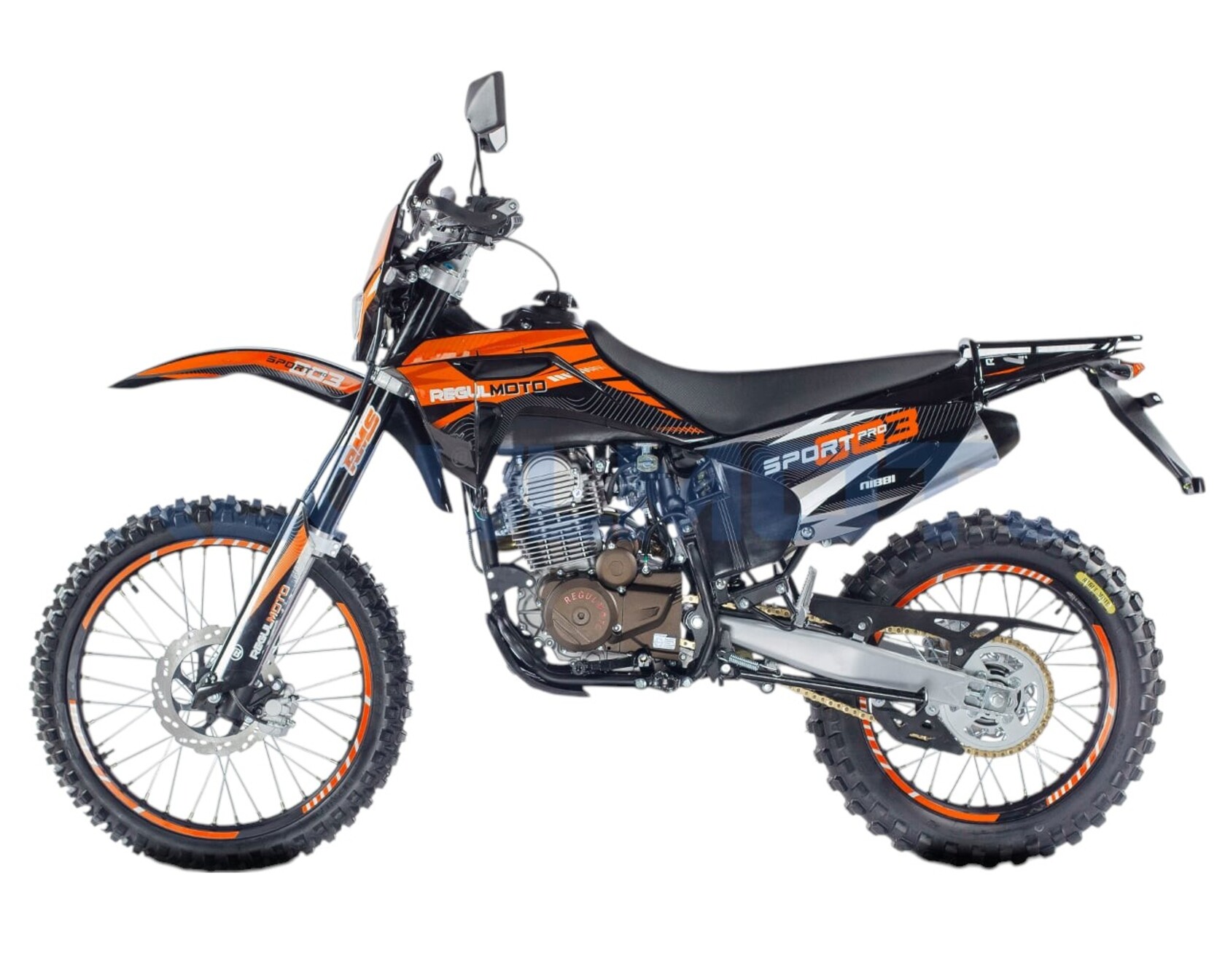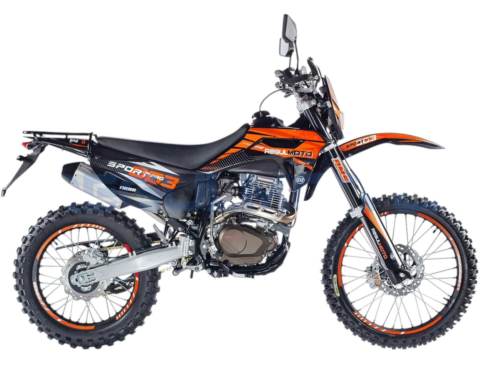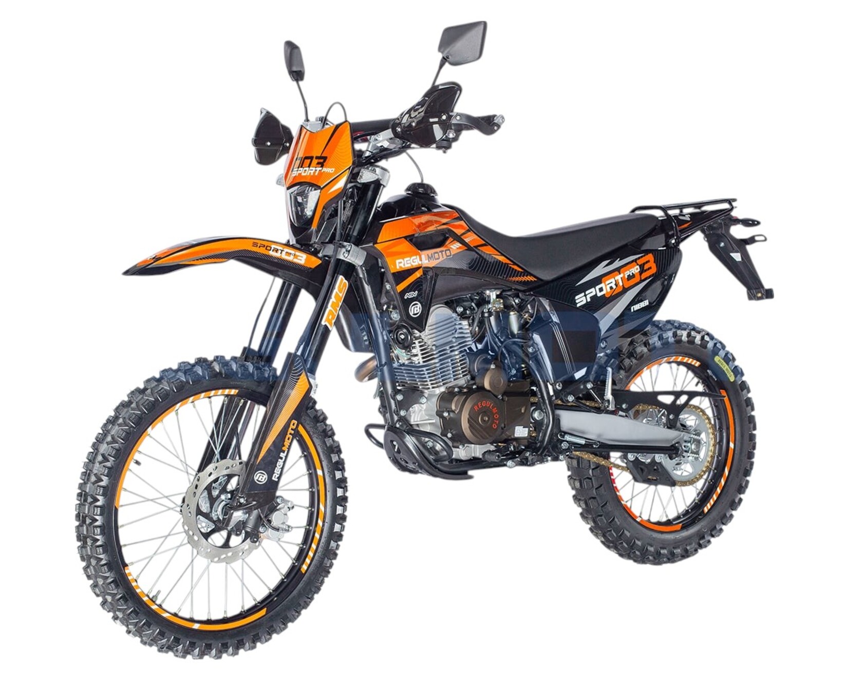 Мотоцикл Regulmoto Sport-003 PR PRO. - Двигатель 172, балансир, 300 поршевая Zongshen, алюминиевые обода, злая резина, новый пластик облицовки бензобака, колодки синтетика.Передние амортизаторы с быстрой регулировкой, 41мм. Алюминиевые диски из одного из самых прочных сплавов 7116. Из этого сплава производятся рули Renthal. Шины с увеличенными грунтозацепами, мягкий компаунд.