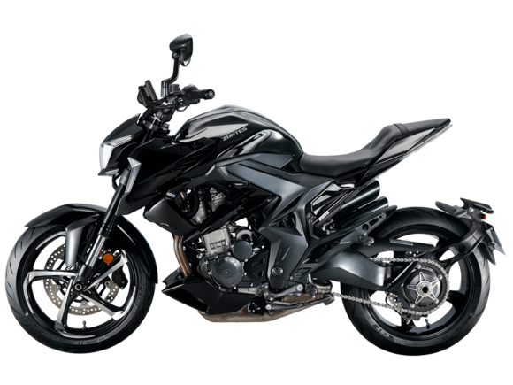 Мотоцикл ZONTES ZT350-R1 – современный нейкед со стремительным и дерзким дизайном. Хорошо подходит как для поездок в городской среде и маневрирования в межрядье.Силовая установка представлена одноцилиндровым 4-тактным двигателем ZT184MP с 4 клапанами и 2 верхними распредвалами. Двигатель имеет объём 348 см³ и обеспечивает мощность в 39 л.с. Оснащён инжектором BOSCH и системой жидкостного охлаждения. Механическая коробка передач имеет 6 ступеней и схему 1-N-2-3-4-5-6. Запуск двигателя осуществляется с помощью бесключевого доступа.Ёмкость топливного бака 15 литров.Колёса представлены литыми алюминиевыми дисками диаметром 17 дюймов. На мотоцикл установлены датчики давления в шинах, показатели от которых выводятся на приборную панель. Для подвески спереди используется телескопическая вилка, сзади – моноамортизатор. Гидравлические дисковые тормоза произведены испанской компанией J.JUAN, входящей в холдинг BREMBO.Для освещения используется яркая LED-оптика, а приборная панель представлена цифровым дисплеем. Рычаги тормоза, сцепления и лапки КПП можно отрегулировать. Имеется 2 USB-порта.Габариты мотоцикла 2030х795х1120 мм. Колёсная база 1390 мм. Высота по седлу 795 мм. Вес 165 кг.