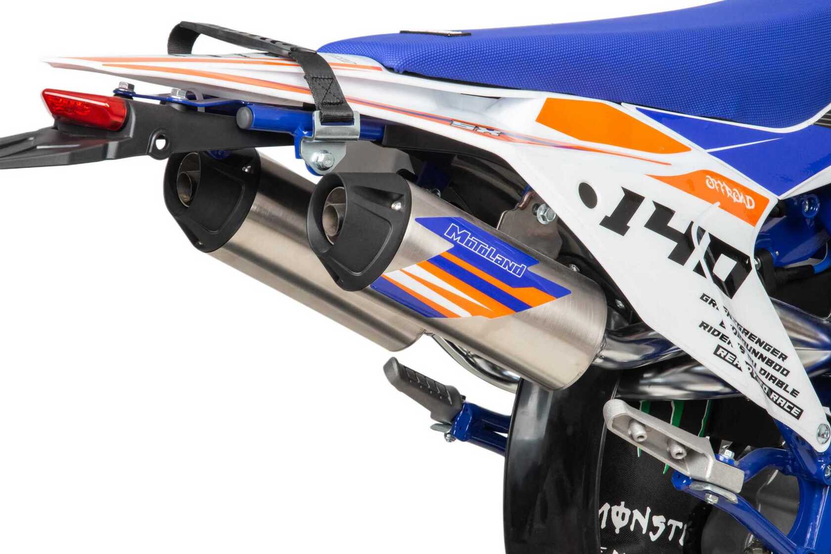 Встречайте долгожданную новинку SX на 140 куб. Питбайк Motoland SX 140 E 19/16 идеален для поездок по грунтовым дорогам и бездорожью. Хорошо чувствует себя на мягком и среднем грунте, разгоняется до 90 км/ч. Оснащён спортивными траверсами и амортизаторами с регулировкой. весит всего 75 кг.Питбайк прост в управлении и не требует специального ухода, подойдёт как новичкам, так и любителям мотокросса.У питбайка отличный узнаваемый дизайн. Конструкция подчёркивает неуступчивый спортивный характер, который не остановится ни перед одним препятствием.Комбинированный прочный пластик не ломается при сгибании.Передняя подвеска — телескопическая вилка перевёрнутого типа с регулировками, которая отлично подходит для преодоления ям, и других неровностей плохих дорог или их отсутствия. Задняя подвеска маятниковая с моноамортизатором тоже с регулировкой.Питбайк оснащён карбюратором NIBBI PE 22 и одноцилиндровым четырёхтактным двигателем с воздушно-масляным охлаждением. Надёжный мотор 156 FMJ
