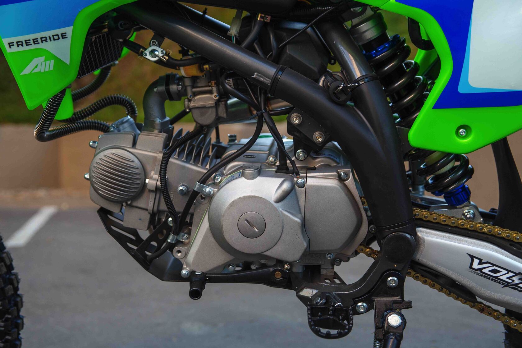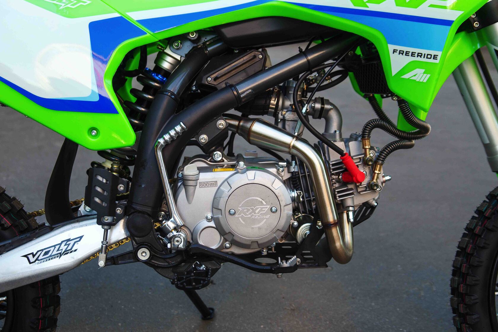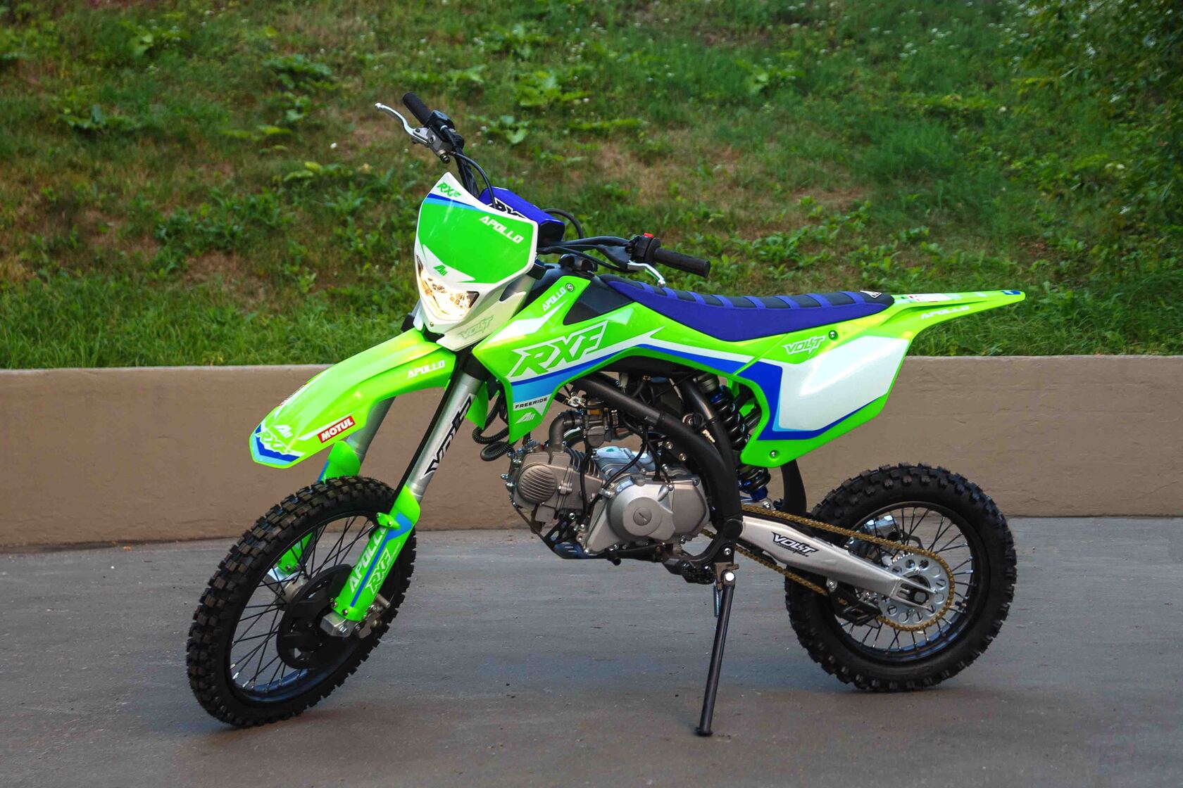Питбайки компании Apollo родом из Франции. Головной офис компании расположен в Париже. Идеология, заложенная в бренд, носит спортивный характер. Улучшение “породы” происходит в гонках.Модели Apollo RXF (17/14) безошибочно узнаваемы благодаря хребтовой раме с V образным профилем боковой проекции начинающейся от точки крепления маятника под углом 45 градусов. Геометрия рамы была переработана и полностью учитывает размерность применяемых колес, а расстояние от подножек до седла одно из самых больших, что в свою очередь благотворно влияет на езду в стойке.Подвески питов оснащаются вилками и амортизаторами volt, топовые модели имеют регулировки по отбою.Хочется отметить, что компания Apollo в линейки RXF, закончило полноценную интеграцию и оптимизацию моделей под “большие колеса”. Это можно заметить при взгляде на питбайки в боковой проекции. Расстояние между баком и рулевой колонкой потеряло “зазор”, причина которого крылась в наращивание переднего треугольника под 17 колесо. Сейчас это пространство полноценно поглотил бак, который в свою очередь увеличил объем с 4,7 литров до внушительных 6,5 л. Полностью новый пластик оптимизирован под пропорции “выросшего питбайка”, сиденье стало тоньше и изящнее, боковые щитки увеличены в размерах, глубокий разрез по боковой линии подчеркивает раму, удлиненное заднее крыло и полностью новое передние, не оставляют шансов грязи. Тормозные диски получили пластиковую защиту, амортизатор брызговик, а карбюратор фильтрбокс. Продуманность компоновки питбайка выгодно отличает данную марку от других брендов.