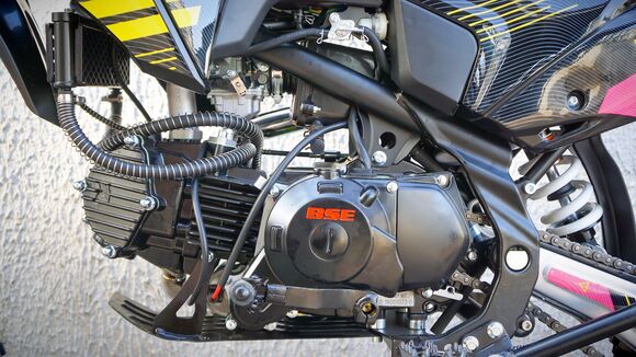 BSE PH150 – король питбайков в линейке BSE.PH150 на колесах 17/14 оснащен самым мощным двигателем среди питбайков BSE и самой богатой комплектацией.Основа PH150 - рама из хромомолибденовой стали повышенной жесткости с литыми усилителями — фирменный знак качества завода BOSUER! Силовая установка питбайка — надежный и тяговитый 4-тактным двигателем YX объёмом 150 см3 с воздушным охлаждением. Максимальная мощность – внушительные 15 л.с. Питает мотор карбюратор MIKUNI VM26. Питбайк оснащен 4-ступенчатой механической трансмиссией. Запуск мотора осуществляется при помощи электростартера или кик-стартера. Подвески с большими ходами: передняя — телескопическая вилка перевёрнуто типа, задняя — моноамортизатор.LED фара головного света, "злая" резина, мощная тормозная система HSK Racing, японские колесные подшипники NTN, защита мотора, руль ProTaper - питбайк полностью укомплектован всем необходимым для покатушек и гонок.PH150 – профессиональный выбор самого продвинутого "питбайкера".