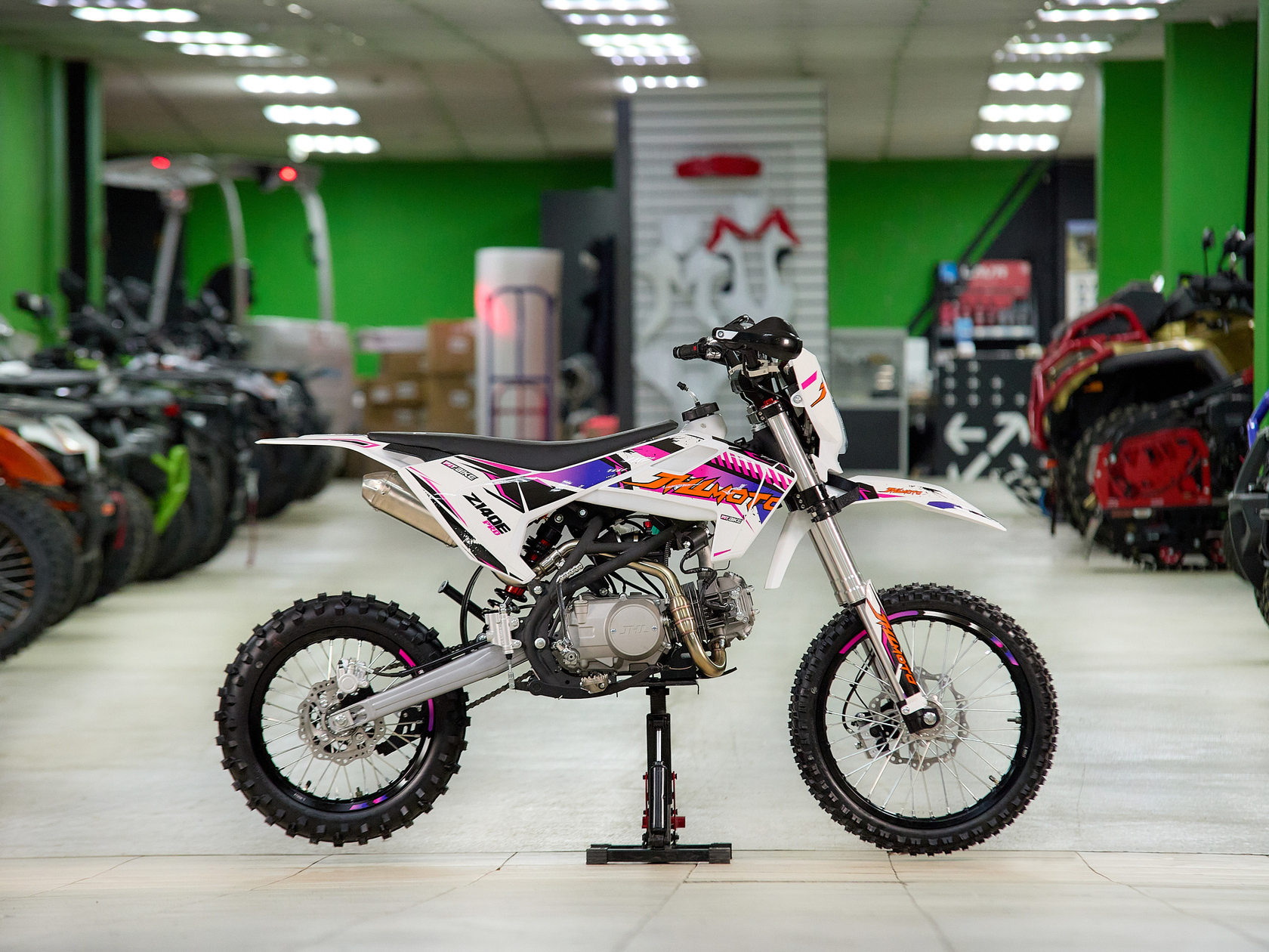 Один из самых быстрых и маневренных питбайков JHL Z140E Pro производится из качественных материалов, отличающихся прочностью и надежностью. Этот китайский кроссовый мотоцикл пользуется спросом у профессиональных мотогонщиков. Но также его за легкий вес и комфортное управление модель выбирают и любители. Основные особенности китайского кроссового питбайка Z140E ProМотоцикл спортивный JHL Z140E Pro обладает оптимальными техническими характеристиками, а также тщательно продуманным дизайном, делающим его использование удобным и сравнительно несложным. Его четырехтактный бензиновый двигатель способен быстро развивать скорость и двигаться по бездорожью до 85 км в час. Основными причинами, почему стоит купить питбайк именно этой модели, являются следующие:мощность в чуть больше одиннадцати конских сил - питбайк вытягивает там, где аналоги могут уже сдаться;прочная стальная рама, которая не боится бездорожья, падений и механических ударов;самая современная система торможения, за счет чего водитель более защищен от непредвиденных ситуаций;небольшой вес и размеры, что позволяет не только использовать его для езды, но и удобно транспортировать к месту мотогонок или буксировать при поломке, хотя китайский мотоцикл редко выходит из строя без серьезных причин;выгодная стоимость у нас, поэтому не нужно искать, где можно купить питбайк недорого.