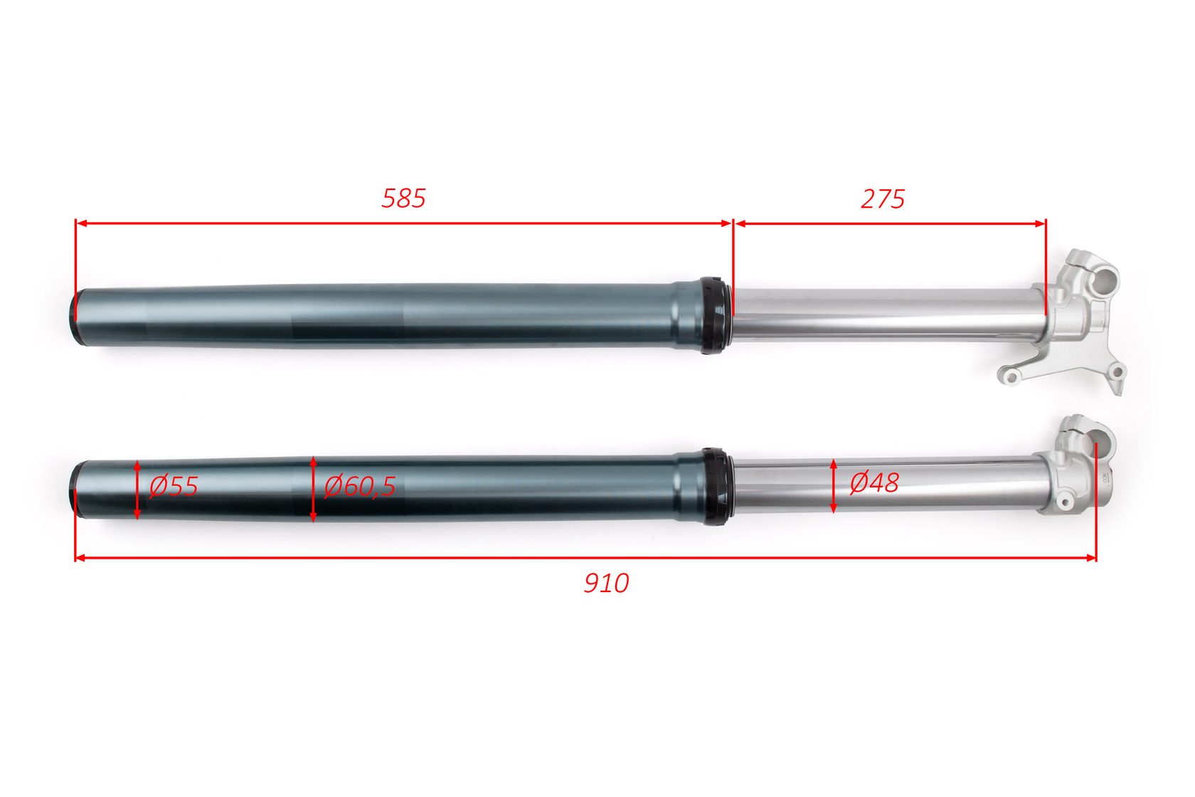 • Перья вилки для полноразмерных эндуро мотоциклов с шасси К8. Длина 910 мм, диаметр пера 48 мм. Однокартриджная конструкция с регулировками сжатия и отбоя. Имеют клапан для сброса воздуха и крепление под суппорт типа KTM.
